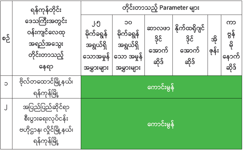 ရန်ကုန်တိုင်းဒေသကြီး၊ ပတ်ဝန်းကျင်ထိန်းသိမ်းရေးဦးစီးဌာနအနေဖြင့် ရန်ကုန်မြို့အတွင်း အောက်ဖော်ပြပါ တိုင်းတာမှတ် (၃) နေရာတွင် Ambient Air Quality Monitoring Station with Mobile Car- (AQMS Mobile Car)၊ Compact Air Quality Monitoring Station- (AQM 65) စက်များကို အသုံးပြု၍ Particulate Matter 2.5 (PM2.5)၊ Particulate Matter 10 (PM10) ၊ Sulphur Dioxide (SO2)၊ Nitro-gen Dioxide (NO2)၊ Ozone (O3) နှင့် Carbon Monoxide (CO) စသည့် အဓိက Parameter (၆) မျိုးကို (၂၄) နာရီ ပုံမှန်တိုင်းတာပြီး လေ့လာဆန်းစစ်လျက်ရှိပါသည်။
