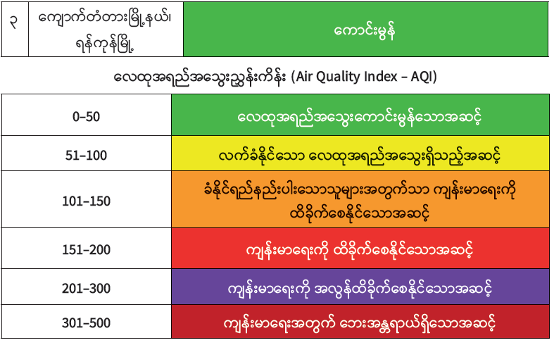 ၂၀၂၆ ခုနှစ် မတ်လ ၂၄ ရက်နေ့တွင် ရန်ကုန်မြို့၏ ဝန်းကျင်လေထုအရည်အသွေး လေ့လာဆန်းစစ်ခြင်းနှင့်ပတ်သက်၍ သတင်းထုတ်ပြန်ချက်