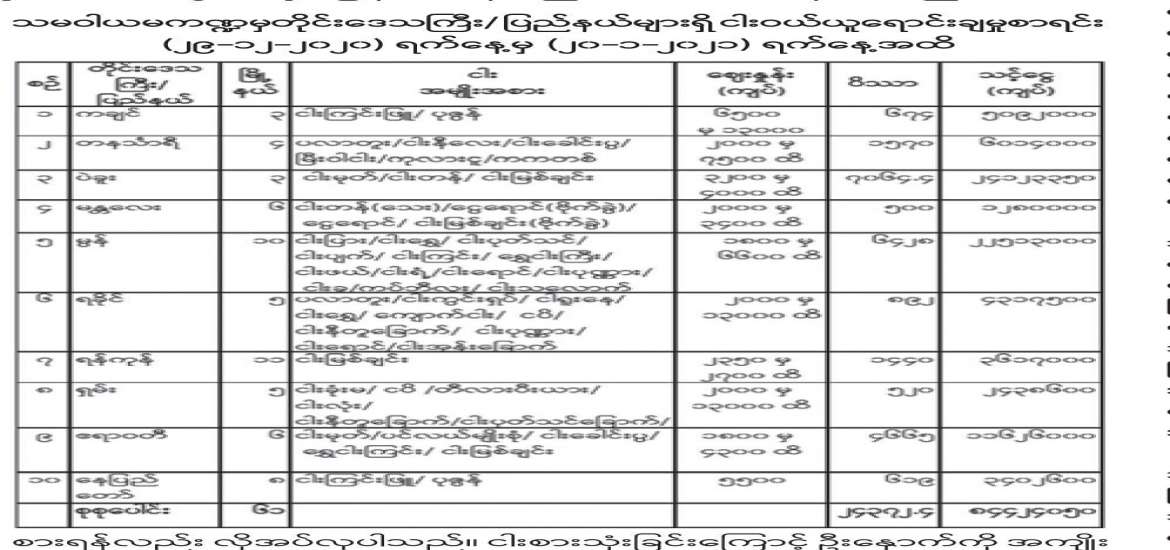 ၂၀၂၁ ခုနှစ် ဇန်နဝါရီလ ၂၁ ရက်အထိ ရေထွက်ကုန်ပစ္စည်းများအား ငွေကျပ် ၈၄၄၂၄၀၅၀ တန်ဖိုးရှိ ငါးပိဿာ ၂၄၃၇၂ ဒသမ ၄ ပိဿာကို ဖြန့်ဖြူး ရောင်းချပေးနိုင်ခဲ့ပြီး နောက်ကာလများတွင်လည်း ပြည်သူအကျိုးအလေး ထား၍ ကြိုးပမ်းပေးနေဦးမည်ကို ယုံကြည်နေမိပါသည်။ တိုင်းဒေသကြီး/ ပြည်နယ် အလိုက် သမဝါယမကဏ္ဍမှ ရောင်းချခဲ့မှုအခြေအနေကို ဖော်ပြပါ အတိုင်း သိရှိရပါသည်။