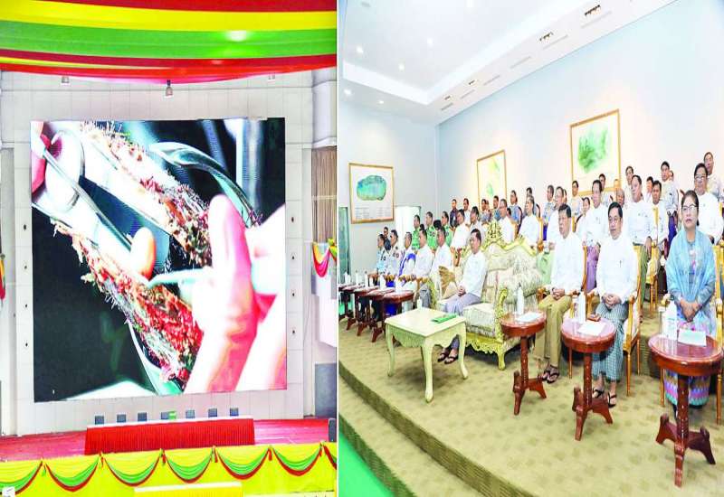 (၁၄၂)ကြိမ်မြောက် မြန်မာ့တောင်ပင်လယ်ပုလဲရောင်းချပွဲ ဖွင့်ပွဲအခမ်းအနားကို ယနေ့နံနက်ပိုင်းတွင် နေပြည်တော်ရှိ မဏိရတနာကျောက်စိမ်းခန်းမ၌ ကျင်းပရာ နိုင်ငံတော်စီမံအုပ်ချုပ်ရေးကောင်စီဥက္ကဋ္ဌ နိုင်ငံတော်ဝန်ကြီးချုပ် ဗိုလ်ချုပ်မှူးကြီး မင်းအောင်လှိုင် တက်ရောက်ချီးမြှင့်သည်။