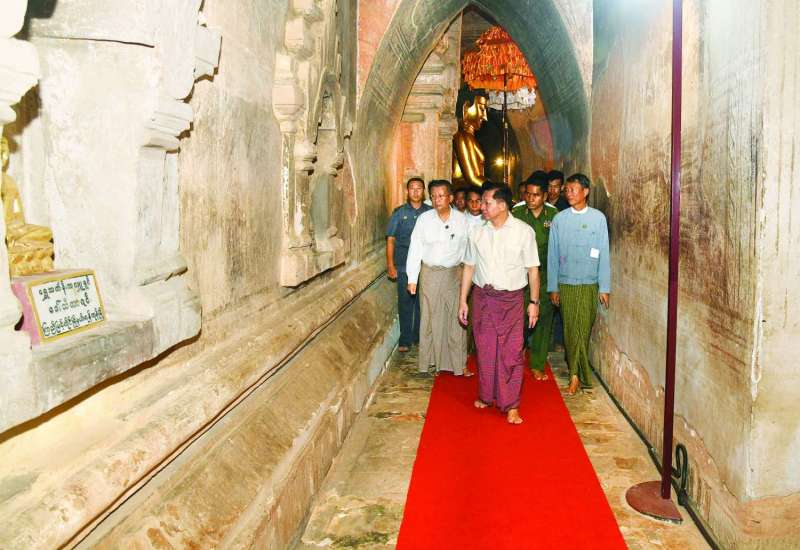 နိုင်ငံတော်စီမံအုပ်ချုပ်ရေးကောင်စီဥက္ကဋ္ဌ နိုင်ငံတော်ဝန်ကြီးချုပ် ဗိုလ်ချုပ်မှူးကြီးမင်းအောင်လှိုင်သည် ခရီးစဉ်တွင်လိုက်ပါလာသည့်အဖွဲ့ဝင်များ၊ မန္တလေးတိုင်းဒေသကြီးဝန်ကြီးချုပ်၊ အလယ်ပိုင်းတိုင်းစစ်ဌာနချုပ်တိုင်းမှူးနှင့် တာဝန်ရှိသူများလိုက်ပါ၍ ယနေ့နံနက်ပိုင်းတွင် မန္တလေးတိုင်းဒေသကြီး၊ ညောင်ဦးခရိုင်၊ ပုဂံရှေးဟောင်းယဉ်ကျေးမှုနယ်မြေအတွင်း ရေကြီးရေလျှံမှုများနှင့် သဘာဝဘေးအန္တရာယ်ကြောင့် ထိခိုက်ပျက်စီးမှုများ ဖြစ်ပေါ်မှုမရှိစေရေး ရှေးဟောင်းကန်များ ပြန်လည်ပြုပြင်ဆောင်ရွက်လျက်ရှိမှု အခြေအနေများကို သွားရောက်ကြည့်ရှုစစ်ဆေးသည်။
