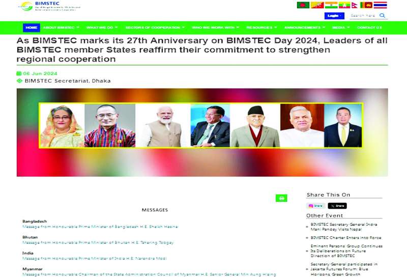 ၂၀၂၄ ခုနှစ် ဇွန် ၆ ရက်တွင် ကျရောက်သည့် ဘင်္ဂလားပင်လယ်အော်ဒေသတွင်း ကဏ္ဍပေါင်းစုံ၊ နည်းပညာနှင့် စီးပွားရေးပူးပေါင်းဆောင်ရွက်မှုအစီအစဉ် (ဘင်းမ်စတက်) တည်ထောင်မှု (၂၇) နှစ်မြောက် အထိမ်းအမှတ်နေ့အတွက် နိုင်ငံတော်စီမံအုပ်ချုပ်ရေးကောင်စီဥက္ကဋ္ဌက ဝမ်းမြောက်ကြောင်းသဝဏ်လွှာ ပေးပို့ခဲ့သည်။