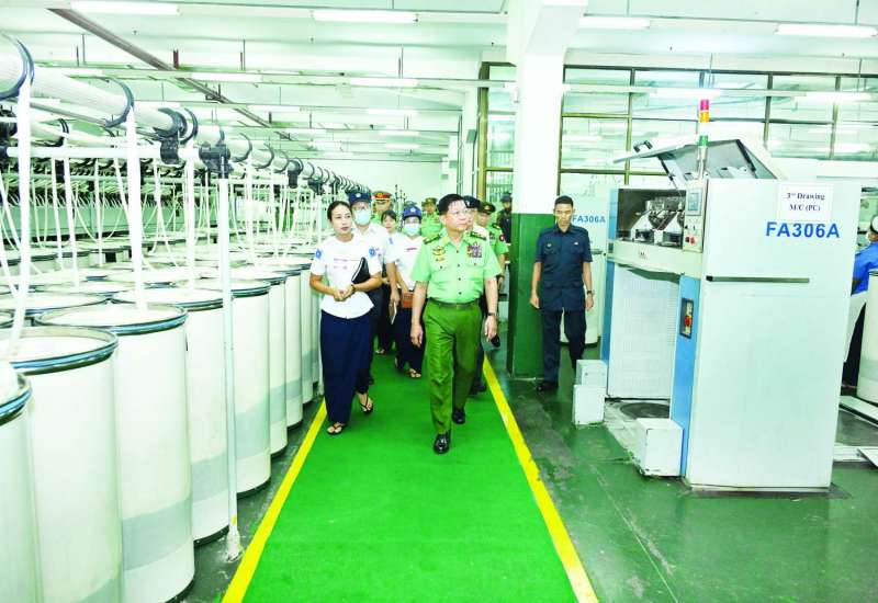 နိုင်ငံတော်စီမံအုပ်ချုပ်ရေးကောင်စီဥက္ကဋ္ဌ တပ်မတော်ကာကွယ်ရေးဦးစီးချုပ် ဗိုလ်ချုပ်မှူးကြီးမင်းအောင်လှိုင်သည် ခရီးစဉ်တွင် လိုက်ပါလာသည့်အဖွဲ့ဝင်များ၊ ရန်ကုန်တိုင်းစစ်ဌာနချုပ်တိုင်းမှူးနှင့် အဖွဲ့ဝင်များလိုက်ပါ၍ ယနေ့နံနက်ပိုင်းတွင် ရန်ကုန်တိုင်းဒေသကြီး၊ လှိုင်မြို့နယ်၊ အမှတ်(၁၂)ရပ်ကွက်ရှိ တပ်မတော်ချည်မျှင်နှင့် အထည်စက်ရုံ(သမိုင်း) သို့ သွားရောက်ကြည့်ရှုစစ်ဆေးသည်။