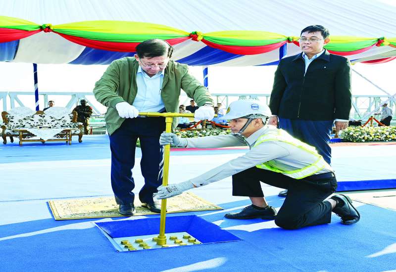 ရန်ကုန်တိုင်းဒေသကြီးအတွင်းရှိ ပဲခူးမြစ်ကူးတံတား (သန်လျင်တံတားအမှတ်-၃) တံတားဆက်ခြင်း အထိမ်းအမှတ် ရွှေမူလီတပ်ဆင်ခြင်း မင်္ဂလာအခမ်းအနားကို ယနေ့နံနက်ပိုင်းတွင် ကျင်းပပြုလုပ်ရာ နိုင်ငံတော်စီမံအုပ်ချုပ်ရေးကောင်စီဥက္ကဋ္ဌ နိုင်ငံတော်ဝန်ကြီးချုပ် ဗိုလ်ချုပ်မှူးကြီး မင်းအောင်လှိုင် တက်ရောက်ချီးမြှင့်ပြီး ရွှေမူလီကို တပ်ဆင်ပေးသည်။