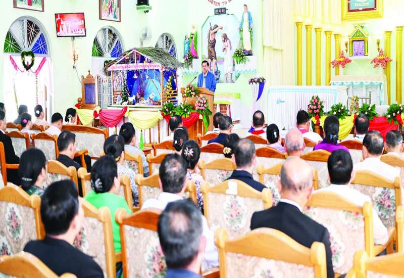 ခရစ်တော်မွေးနေ့ (ခရစ္စမတ်) ကျေးဇူးတော်ချီးမွမ်းခြင်းအခမ်းအနားကို ယနေ့ မွန်းလွဲပိုင်းတွင် နေပြည်တော်ကောင်စီနယ်မြေ ပျဉ်းမနားမြို့ ရန်အောင် (၁) ရပ်ကွက်ရှိ စိန့်မိုင်ကယ်ကက်သလစ်ဘုရားကျောင်း၌ ကျင်းပပြုလုပ်ရာ နိုင်ငံတော်စီမံအုပ်ချုပ်ရေးကောင်စီဥက္ကဋ္ဌ နိုင်ငံတော်ဝန်ကြီးချုပ် ဗိုလ်ချုပ်မှူးကြီးမင်းအောင်လှိုင် တက်ရောက်ချီးမြှင့်သည်။