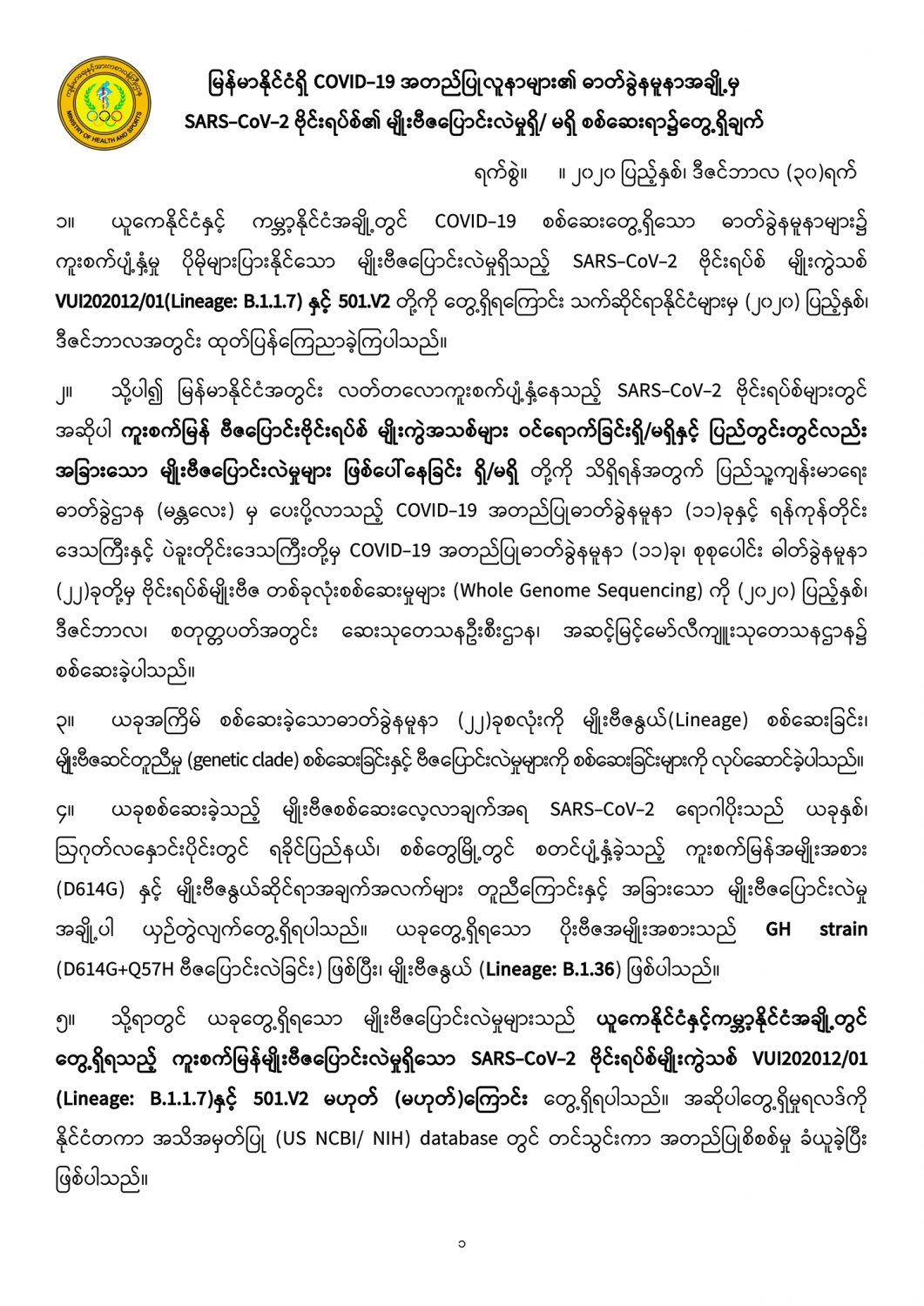 ၁။ ယူကေနိုင်ငံနှင့် ကမ္ဘာ့နိုင်ငံအချို့တွင် COVID-19 စစ်ဆေးတွေ့ရှိသော ဓာတ်ခွဲနမူနာများ၌ ကူးစက်ပျံ့နှံ့မှု ပိုမိုများပြားနိုင်သော မျိုးဗီဇပြောင်းလဲမှုရှိသည့် SARS-CoV-2 ဗိုင်းရပ်စ် မျိုးကွဲသစ် VUI202012/01(Lineage: B.1.1.7) နှင့် 501.V2 တို့ကို တွေ့ရှိရကြောင်း သက်ဆိုင်ရာနိုင်ငံများမှ (၂၀၂၀) ပြည့်နှစ်၊ ဒီဇင်ဘာလအတွင်း ထုတ်ပြန်ကြေညာခဲ့ကြပါသည်။