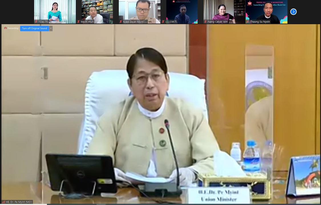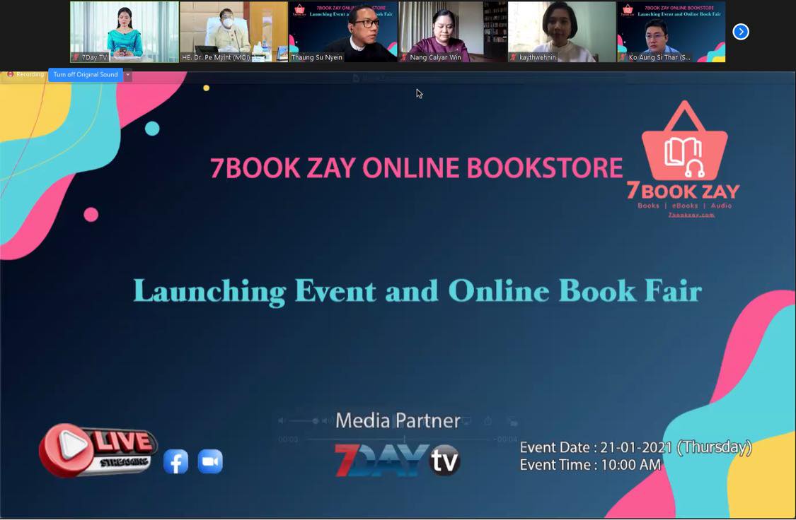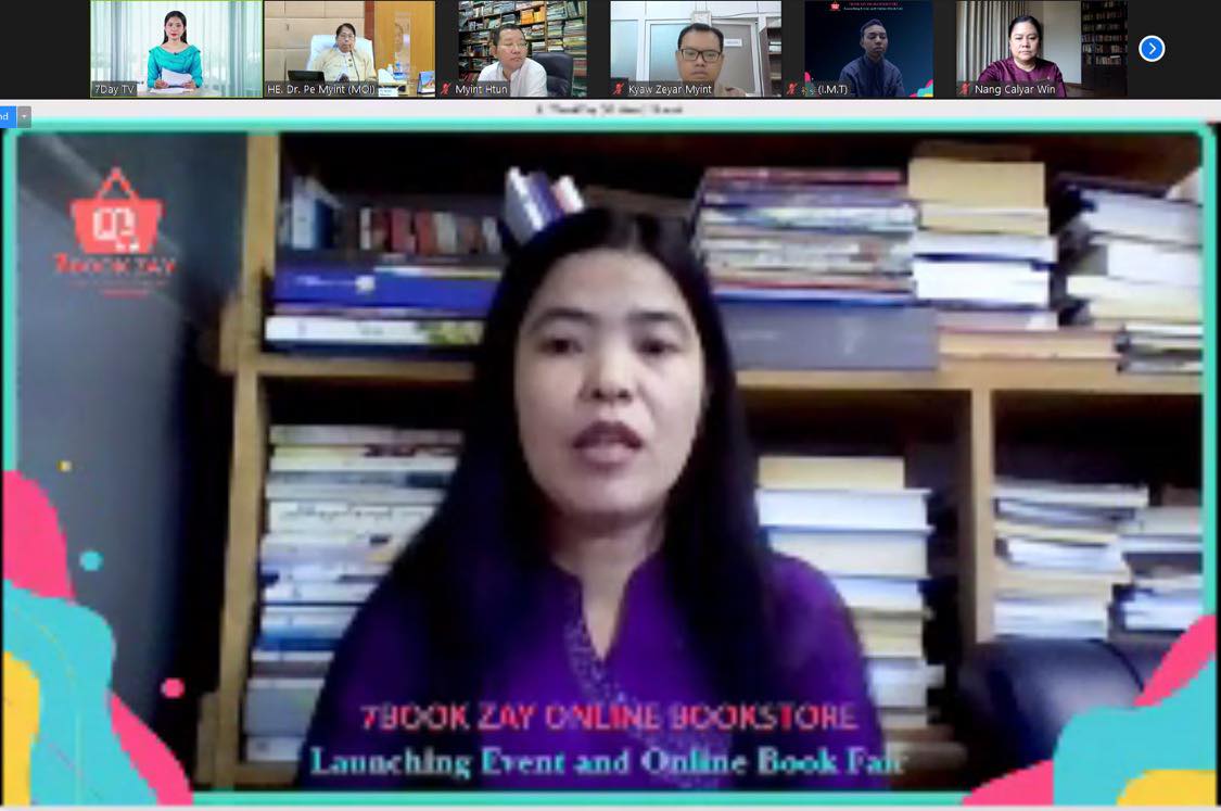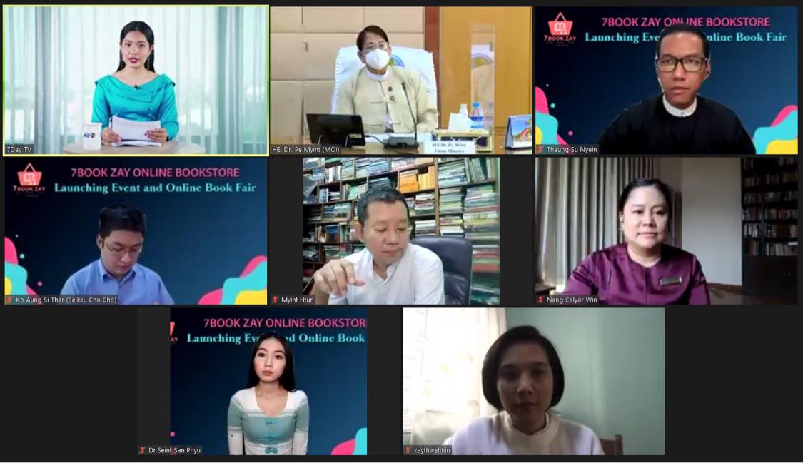 စာပေထုတ်ဝေဖြန့်ချိရေးကဏ္ဍအား ဒီဂျစ်တယ်စီးပွားရေး လုပ်ငန်းသစ်တစ်ခုအဖြစ် ပိုမိုတိုးတက်အောင်မြင်စေရေးနှင့် ပံ့ပိုးကူညီပေးနိုင်ရေး အတွက် 7 Book Zay Online Bookstore (7BookZay.com)  မိတ်ဆက်ပွဲ အခမ်းအနားကို ယနေ့နံနက်(၁၀)နာရီက Virtual စနစ်ဖြင့် ကျင်းပရာ ပြန်ကြားရေးဝန်ကြီးဌာန၊ ပြည်ထောင်စုဝန်ကြီး ဒေါက်တာဖေမြင့် တက်ရောက်ခဲ့သည်။
