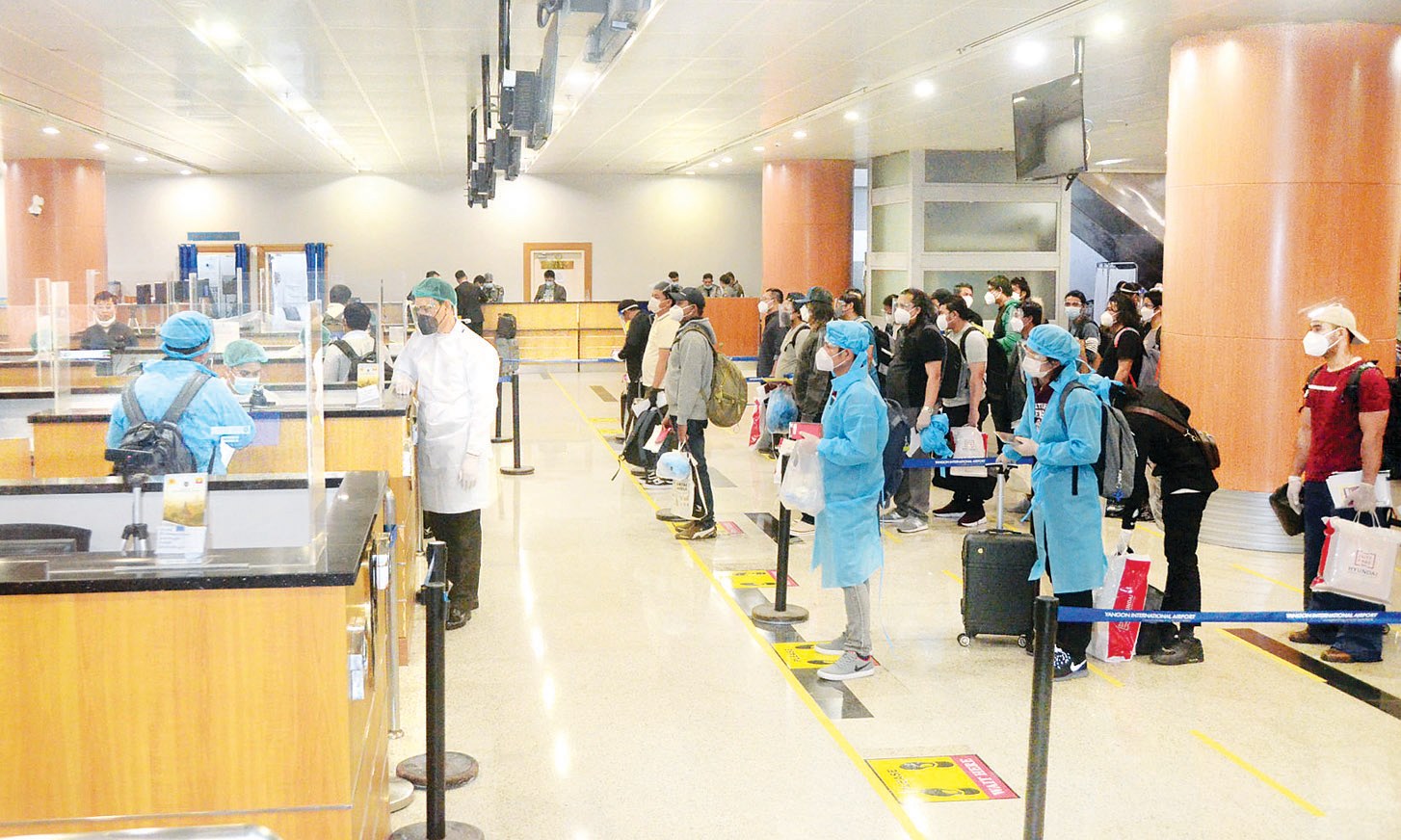 ၎င်းတို့ ရန်ကုန်အပြည်ပြည် ဆိုင်ရာလေဆိပ်သို့ ရောက်ရှိချိန်တွင် လူဝင်မှုကြီးကြပ်ရေး၊ ကျန်းမာရေးစိစစ်ရေး၊ သီးသန့် စီစဉ်ပေးသည့် နေရာ / သတ်မှတ် ဟိုတယ်များ၌ အသွားအလာ ကန့်သတ်မှု ၁၄ ရက် နှင့်နေအိမ်တွင် အသွားအလာ ကန့်သတ်မှု ခုနစ်ရက် နေထိုင်စေရေးတို့ကို အလုပ်သမား၊ လူဝင်မှုကြီးကြပ် ရေးနှင့်ပြည်သူ့အင်အားဝန်ကြီးဌာန၊ ကျန်းမာရေးနှင့် အားကစားဝန်ကြီးဌာနနှင့် ရန်ကုန်တိုင်းဒေသကြီး အစိုးရအဖွဲ့တို့မှ သက်ဆိုင်ရာအခန်း ကဏ္ဍအလိုက် တာဝန်ယူဆောင်ရွက် ပေးကြသည်။