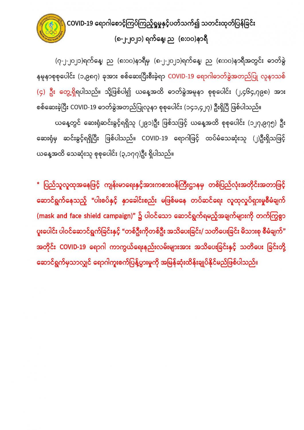 Covid-19 ရောဂါစောင့်ကြပ်ကြည့်ရှုမှုနှင့်ပတ်သက်၍ သတင်းထုတ်ပြန်ခြင်း (၈-၂-၂၀၂၁) ရက်နေ့၊ ည (၈:၀၀)နာရီ