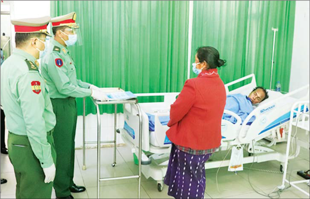 ဆေးရုံတက်လူနာများကိုသက်ဆိုင်ရာ တိုင်းစစ်ဌာနချုပ်အသီးသီးမှ တာဝန် ရှိသူများက လည်း ကောင်း သွားရောက် ကြည့်ရှုအားပေးပြီး စားသောက် ဖွယ်ရာများ ပေးအပ်ခဲ့ကြောင်း တပ်မတော်ကာကွယ်ရေး ဦးစီးချုပ် ရုံး၏ သတင်းထုတ်ပြန်ချက်အရ သိရသည်။