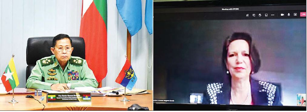 နိုင်ငံတော်စီမံအုပ်ချုပ်ရေးကောင်စီ ဒုတိယဥက္ကဋ္ဌ ဒုတိယတပ်မတော်ကာကွယ်ရေးဦးစီးချုပ် ကာကွယ်ရေးဦးစီးချုပ်(ကြည်း) ဒုတိယဗိုလ်ချုပ်မှူးကြီး စိုးဝင်း ကုလသမဂ္ဂ အထွေထွေအတွင်းရေးမှူးချုပ်၏ မြန်မာနိုင်ငံဆိုင်ရာ အထူးကိုယ်စားလှယ်အား Video Conferencing ဖြင့် တွေ့ဆုံဆွေးနွေး