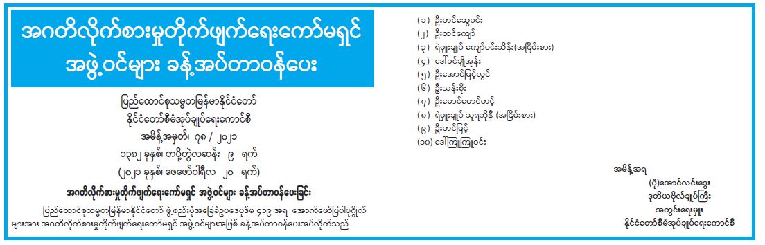 အဂတိလိုက်စားမှုတိုက်ဖျက်ရေးကော်မရှင် အဖွဲ့ဝင်းများ ခန့်အပ်တာတာဝန်ပေး