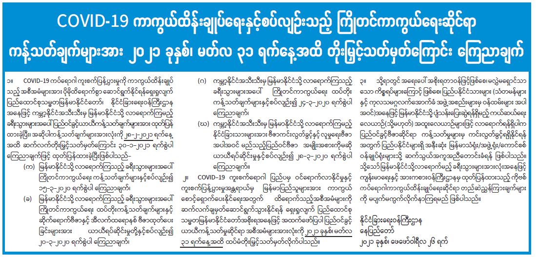 COVID – 19 ကာကွယ်ထိန်းချုပ်ရေးနှင့်စပ်လျဉ်းသည့် ကြိုတင်ကာကွယ်ရေးဆိုင်ရာ ကန့်သတ်ချက်များအား ၂၀၂၁ ခုနှစ်၊ မတ်လ ၃၁ ရက်နေ့အထိ တိုးမြှင့်သတ်မှတ်ကြောင်း ကြေညာချက် 02/27/2021