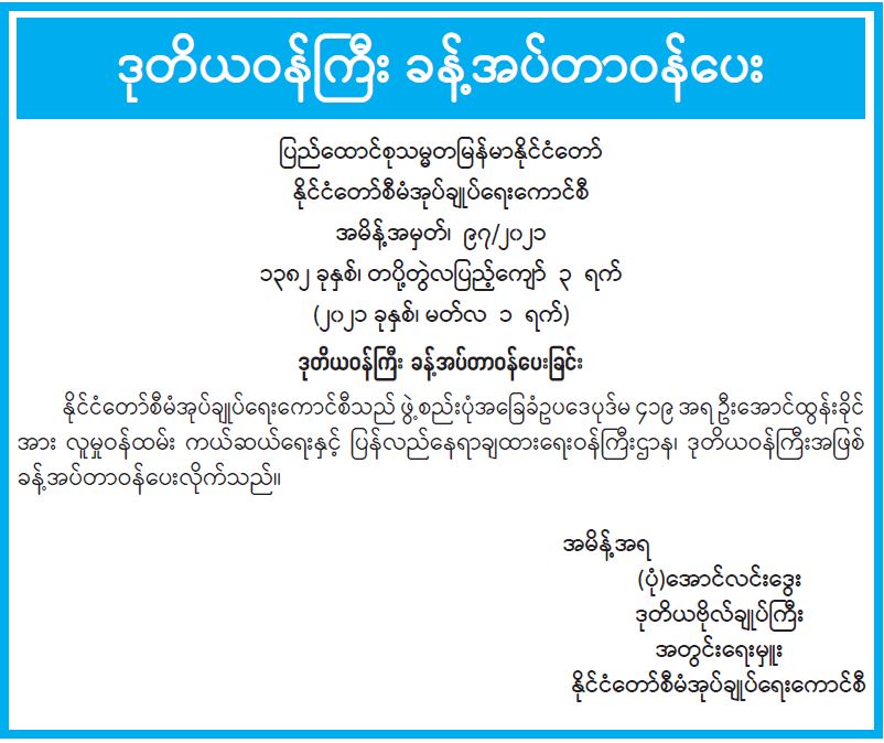 ဒုတိယဝန်ကြီး ခန့်အပ်တာဝန်ပေး