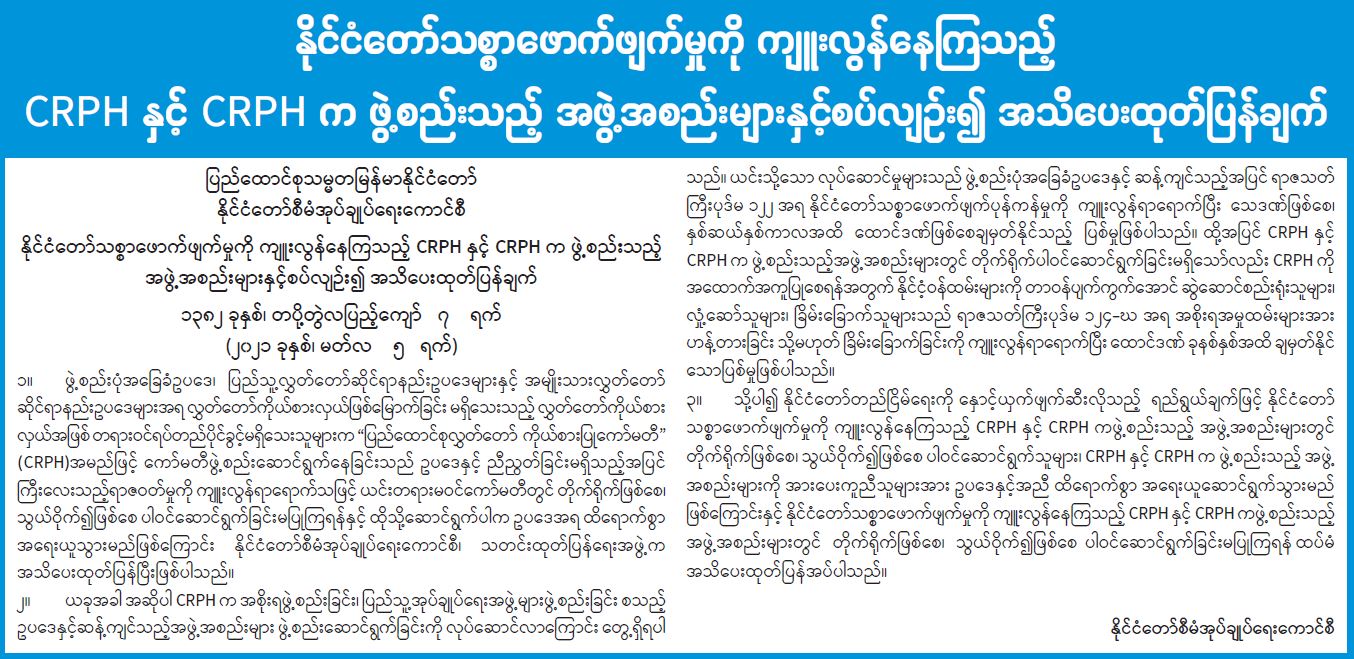 နိုင်ငံတော်သစ္စာဖောက်ဖျက်မှုကို ကျူးလွန်ကြသည် CRPH နှင့် CRPH က ဖွဲ့စည်းသည့် အဖွဲ့အစည်းများနှင့် စပ်းလျဉ်း၍ အသိပေးထုတ်ပြန်ချက်