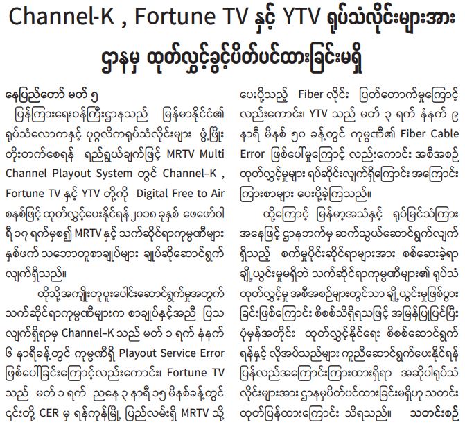 Channel-K , Fortune TV နှင့် YTV ရုပ်သံလိုင်းများအား ဌာနမှ ထုတ်လွှင့်ခွင့် ပိတ်ပင်ထားခြင်း မရှိ 03/06/2021