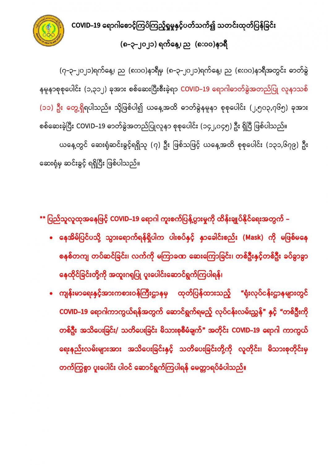 COVID-19 ရောဂါစောင့်ကြပ်ကြည့်ရှုမှုနှင့်ပတ်သက်၍ သတင်းထုတ်ပြန်ခြင်း (8-3-2021, 8:00 PM) 03/08/2021 နေပြည်တော်