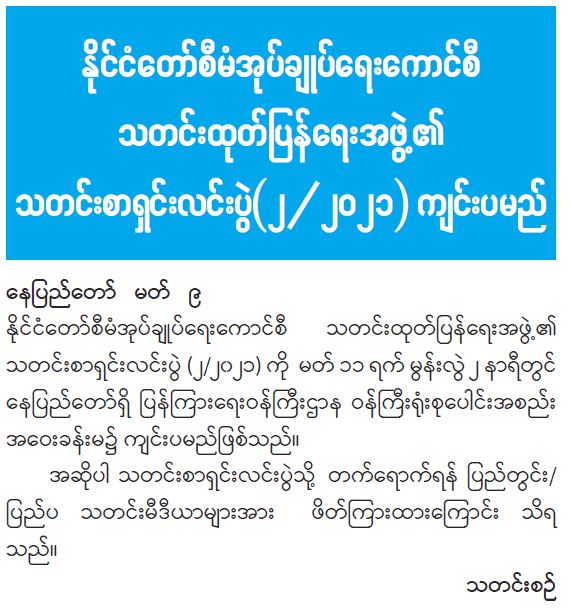 နိုင်ငံတော်စီမံအုပ်ချုပ်ရေးကောင်စီ သတင်းထုတ်ပြန်ရေးအဖွဲ့၏ သတင်းစာရှင်းလင်းပွဲ (၂/၂၀၂၁) ကျင်းပမည်
