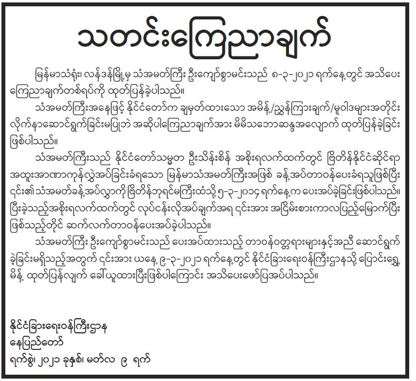 ဝန်ကြီးဌာန ကြေညာချက်များ
