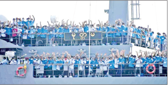 ကိုဗစ်ရောဂါဖြစ်ပွားနေတဲ့ ကာလ အတွင်း နိုင်ငံရပ်ခြားမှာ ကာလကြာရှည် စွာ ပိတ်မိဒုက္ခခံနေကြရတဲ့ မြန်မာနိုင်ငံ သားများ မိမိတို့နိုင်ငံသို့ ပြန်လည် ရောက်ရှိလာနိုင်စေဖို့အတွက် နိုင်ငံတော် စီမံအုပ်ချုပ်ရေး ကောင်စီဥက္ကဋ္ဌ၏ လမ်းညွှန်ချက် များအတိုင်း ဆောင်ရွက်မှု တစ်ရပ်အဖြစ် မလေးရှားနိုင်ငံတွင် ယခင်ကာလများကတည်းက အကြောင်း အမျိုးမျိုးကြောင့် မြန်မာနိုင်ငံသို့ ပြန်လာရန် အခက်အခဲကြုံနေကြရတဲ့ မြန်မာ နိုင်ငံသားများကို ပြန်လည်ခေါ်ဆောင်ရန် အတွက် တပ်မတော်ရေမှ တာဝန်ရှိသူများ ဦးဆောင်တဲ့ စစ်ရေယာဉ် သုံးစင်းဟာ ရန်ကုန်မြို့မှ မလေးရှားနိုင်ငံသို့ ဖေဖော် ဝါရီလ ၁၅ ရက်နေ့က စတင်ထွက်ခွာခဲ့ကြ ပါတယ်။ မလေးရှားနိုင်ငံမှာ ရောက်ရှိ ပိတ်မိနေတဲ့ မြန်မာ နိုင်ငံသား ၁၀၈၆ ဦး ကို မလေးရှားနိုင်ငံဆိုင်ရာ မြန်မာသံရုံးနဲ့ မလေးရှားနိုင်ငံ လူဝင်မှု ကြီးကြပ်ရေးဌာန မှ တာဝန်ရှိ သူများထံမှ စနစ်တကျ လွှဲပြောင်းလက်ခံခဲ့ပြီး ဖေဖော်ဝါရီလ ၂၃ ရက်နေ့မှာ မြန်မာနိုင်ငံကို ပြန်လည် ခုတ်မောင်းလာခဲ့ပါတယ်။