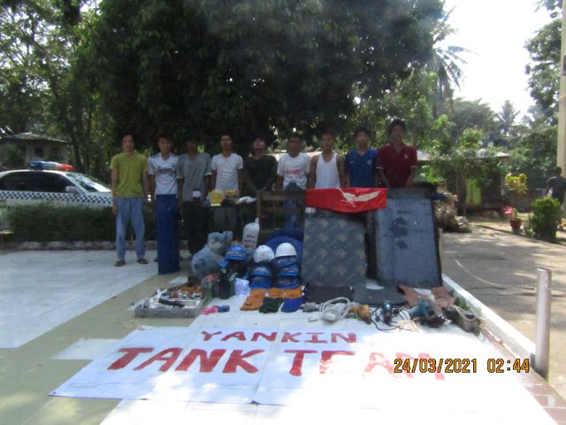 ထိုသို့ရှာဖွေခဲ့ရာ အိမ်အတွင်း၌ မင်းလွင် (၄၈)နှစ် (ဘ) ဦးသောင်းညွှန့်နှင့်အတူ ဇွဲမင်းကို (၂၂)နှစ် (ဘ) ဦးမင်းလွင်၊ ညီသက်ထွေး (၂၈)နှစ် (ဘ) ဦးလှသန်း၊ ပြည့်ဖြိုးမောင် (၂၆)နှစ် (ဘ) ဦးစောအယ်ဝါး၊ တင်ကိုဦး (၂၄)နှစ် (ဘ) ဦးကျော်မြင့်၊ ချစ်ကိုဦး (၂၇)နှစ် (ဘ) ဦးကျော်မြင့် တို့(၆)ဦးအား တွေ့ရှိသဖြင့် ထိန်းသိမ်းခဲ့ပြီး ဆက်လက်ရှာဖွေခဲ့ရာ နေအိမ်အတွင်းမှ ဂျင်ကလိ ၁၉၀ ချောင်း၊ ဂျင်ကလိပြုလုပ်ရန် ပိုင်းဖြတ်ထားသော သံချောင်း ၃၀၀ ချောင်း၊ စမုတ်တံ ၂၀ ချောင်း၊ လေးခွ ၇ လက်၊ လက်လုပ်မီးခိုးမိုင်း ၁ လုံး၊ ဒိုင်းမျိုးစုံ ၂၇ ခု၊ ကျည်ကာအင်္ကျီမျိုးစုံ ၃ ထည်၊ ယမ်းစိမ်း ၃ ကျပ်သား၊ ဦးထုပ်မျိုးစုံ ၁၀ လုံး၊ လက်အိတ်အကြီး/အသေး ၅ စုံ၊ ဖြတ်စက် ၂ လုံး၊ ဖောက်စက် ၁ လုံး၊ မီးပုလင်းပြုလုပ်မည့် ပစ္စည်းများနှင့် ဆက်စပ်ပစ္စည်းတို့အား တွေ့ရှိသိမ်းဆည်း ရမိခဲ့ပါသည်။