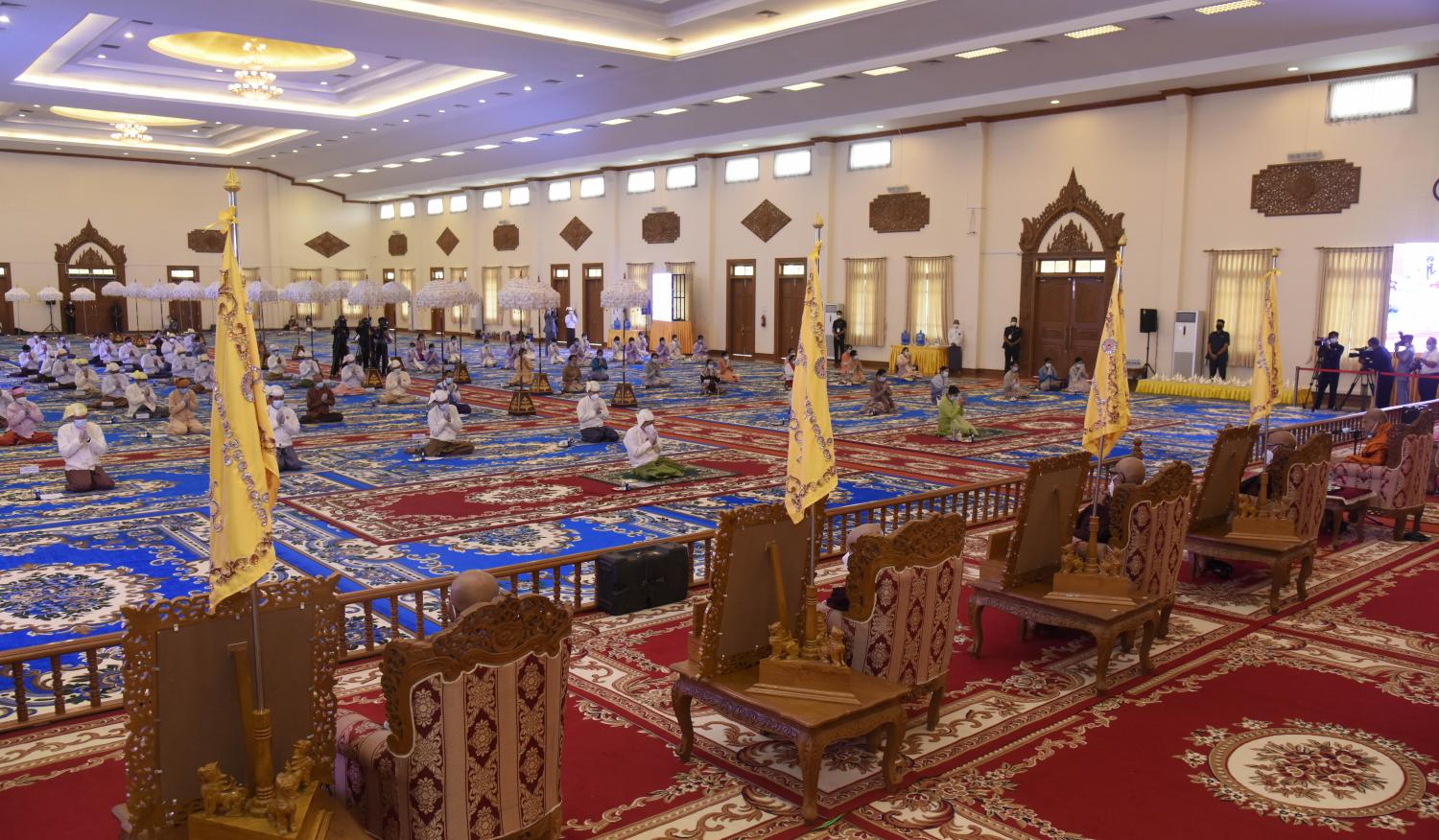 အခမ်းအနားကို နမောတဿ သုံးကြိမ်ရွတ်ဆို ဘုရားကန်တော့၍ ဖွင့်လှစ်ပြီး နိုင်ငံတော်သံဃမဟာနာယကအဖွဲ့ ဥက္ကဋ္ဌ ဗန်းမော်ဆရာတော် ဘုရားကြီးထံမှ နိုင်ငံတော် စီမံအုပ်ချုပ်ရေးကောင်စီဥက္ကဋ္ဌ၊ တပ်မတော်ကာကွယ်ရေးဦးစီးချုပ် နှင့်ဇနီးနှင့် ဧည့်ပရိသတ်တို့က ငါးပါးသီလ ခံယူဆောက်တည်ကြသည်။