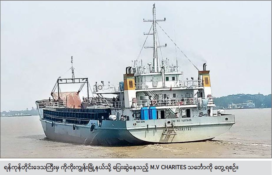 ရန်ကုန်တိုင်းဒေသကြီး စီမံအုပ်ချုပ်ရေးကောင်စီ၏ စီမံမှု၊ ရန်ကုန်တိုင်းဒေသကြီး သယ်ယူပို့ ဆောင်ရေးကြီးကြပ်ကွပ်ကဲမှု အာဏာပိုင်အဖွဲ့၏ ကြီးကြပ်မှုဖြင့် ကိုကိုးကျွန်းမြို့နယ်သို့ ပြေးဆွဲပေးမည့် M.V CHARITES သင်္ဘောခရီးစဉ်သည် ယနေ့မွန်းလွဲ ၂ နာရီတွင် ရန်ကုန်မြို့ ဆူးလေဆိပ်ကမ်းမှ စတင်ထွက်ခွာသွားပြီဖြစ်ကြောင်း သိရသည်။