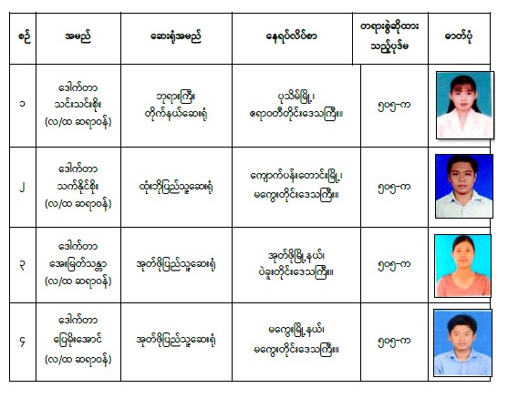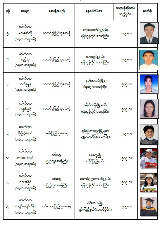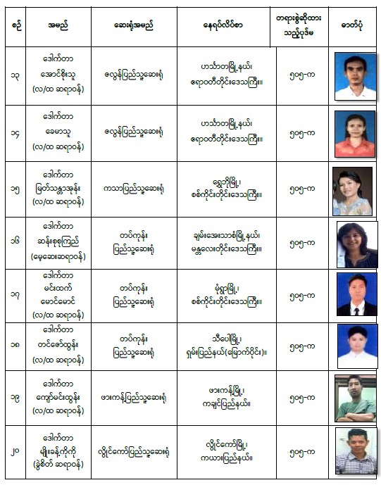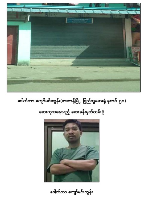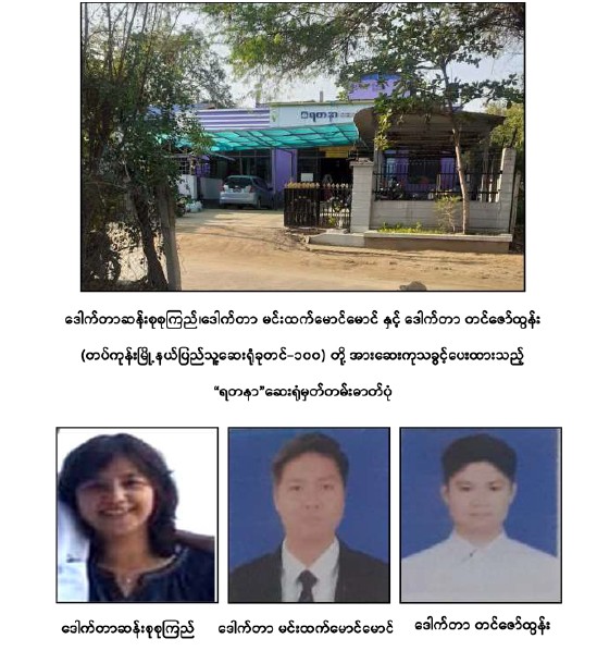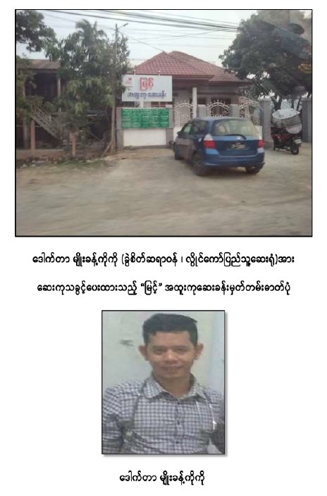 ဖော်ပြပါ ဆရာဝန်များအနက် တပ်ကုန်းမြို့နယ်ပြည်သူ့ဆေးရုံ(ခုတင်-၁၀၀)မှ ဒေါက်တာ ဆန်းစုစုကြည် (မေ့ဆေးဆရာဝန်)၊ ဒေါက်တာ မင်းထက်မောင်မောင် (လ/ထ ဆရာဝန်)၊ ဒေါက်တာ တင်ဇော်ထွန်း (လ/ထ ဆရာဝန်)တို့သည် “ရတနာ’’ ဆေးရုံ၌လည်း ကောင်း၊ ဖားကန့်မြို့ပြည်သူ့ဆေးရုံ(ခုတင်-၅၀)မှ ဒေါက်တာ ကျော်မင်းထွန်း(လ/ထ ဆရာဝန်)သည် စိစစ်ဆဲဆေးခန်း၌လည်းကောင်း၊ လွိုင်ကော်မြို့ ပြည်သူ့ဆေးရုံမှ ဒေါက်တာ မျိုးခန့်ကိုကို (ခွဲစိတ်ဆရာဝန်) သည် “မြင့်’’ အထူးကုဆေးခန်း၌ လည်းကောင်း တာဝန်ကျရာ ဆေးရုံများတွင် ကုသခြင်းမပြုဘဲ CDM ပြုလုပ်၍ ပြင်ပပုဂ္ဂလိက ဆေးရုံ/ဆေးခန်းများတွင် သွားရောက် ကုသလျက်ရှိကြောင်း မှတ်တမ်းဓာတ်ပုံများ နှင့်အတူ အောက်ပါ အတိုင်း စိစစ်တွေ့ရှိရပါသည်။