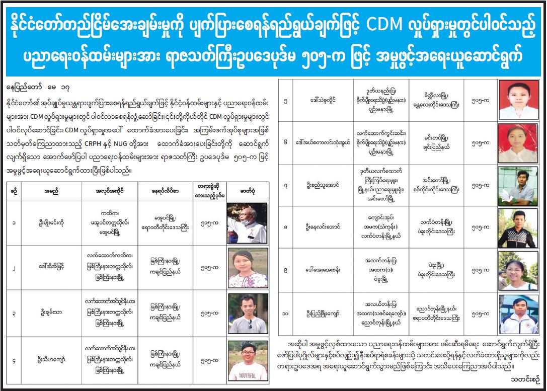 နိုင်ငံတော် တည်ငြိမ်အေးချမ်းမှုကို ပျက်ပြားစေရန် ရည်ရွယ်ချက်ဖြင့် CDM လှုပ်ရှားမှုတွင် ပါဝင်သည့် ပညာရေး ဝန်ထမ်းများအား ရာဇသတ်ကြီး ဥပဒေပုဒ်မ ၅၀၅-က ဖြင့် အမှုဖွင့် အရေးယူဆောင်ရွက် 05/18/2021
