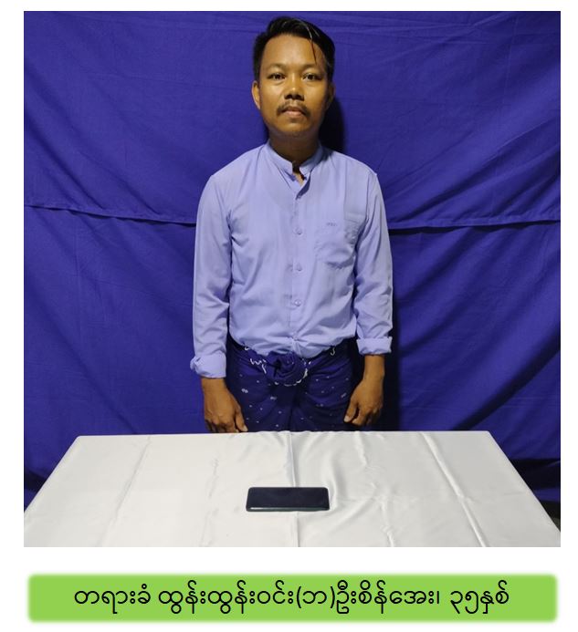 ထိုသို့ လုပ်ဆောင်လျက်ရှိရာ လူမှုကွန်ယက်စာမျက်နှာ၌ အများပြည်သူနှင့် အစိုးရဝန်ထမ်းများအား အထိတ်တလန့်ဖြစ်စေရန် သွေးထိုးလှုံ့ဆော်ရေးသားခြင်း၊ တရားမဝင်အဖွဲ့အစည်းဖြစ်သည့် CRPH အား ထောက်ခံရေးသားခြင်းနှင့် CDM လှုပ်ရှားမှုတွင် မပါဝင်သည့် ဝန်ထမ်းများအား ဖိအားပေးခြိမ်းခြောက်ခြင်းများ ပြုလုပ် ခဲ့သူ ထွန်းထွန်းဝင်း(ဘ) ဦးစိန်အေး(ဇေယျာသီရိဈေး တာဝန်ခံ)အား မေ ၁၆ ရက် နံနက် ၁၁ နာရီ ၄၅ မိနစ်ခန့်တွင် ၎င်းနေထိုင်သည့် တနင်္သာရီတိုင်းဒေသကြီး၊ မြိတ်မြို့၊ မြိတ်တောင်နယ်မြေ၊ ကမ်းနားလမ်း၊ စည်ပင်ဝန်ထမ်းအိမ်ရာ၌ ဖမ်းဆီးရမိခဲ့ပြီး မြိတ်မြို့မရဲစခန်း၌ ရာဇသတ်ကြီးပုဒ်မ ၅၀၅-က ဖြင့် အမှုဖွင့်အရေးယူဆောင် ရွက်လျက်ရှိကြောင်း သတင်းရရှိသည်။