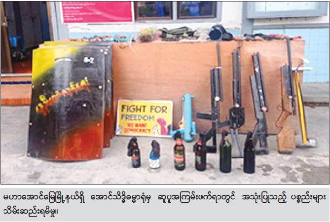 အလားတူ ညနေ ၅ နာရီခွဲခန့်တွင် မန္တလေးတိုင်းဒေသကြီး၊ မဟာအောင် မြေမြို့နယ်၊ မဟာနွယ်စဉ်ရပ်ကွက်၊ ၇၁ လမ်းနှင့် ၇၂ လမ်းကြား၊ ၃၈ လမ်းနှင့် ၃၉ လမ်းကြားရှိ အောင်သိဒ္ဓိ ဓမ္မာရုံ၏ စတိုခန်းအတွင်းမှ လက်လုပ်သေနတ် ၅ လက်၊ ဓားရှည် ၃ ချောင်း၊ ဂျင်ကလိ ၁၀၃ ချောင်းအပါအဝင် ဆက်စပ်ပစ္စည်းများအားလည်းကောင်း၊ ည ၇ နာရီ ၄၅ မိနစ်ခန့်တွင် ရန်ကုန်တိုင်းဒေသကြီး၊ ကမာရွတ်မြို့နယ်၊ အမှတ်(၃)ရပ်ကွက်၊ မဟာဘောဂ(၁)လမ်း၊ ခြံအမှတ်(၃) လူနေထိုင်ခြင်းမရှိသည့် ခြံဝန်းအတွင်းမှ မီးစာတပ်ဆင် ထားသော ဓာတ်ဆီပုလင်း ၃၄ လုံး၊ လက်လုပ်မိုင်း ၁ လုံးနှင့် အခြားဆက်စပ်ပစ္စည်းများအားလည်းကောင်း၊ ည ၉ နာရီခန့်တွင် ပဲခူးတိုင်းဒေသကြီး၊ ပဲခူးမြို့၊ ကျွန်းသာယာရပ်ကွက်ရှိ “အောင်ရတနာ” ဘုန်းကြီးကျောင်းတိုက်၌ ဥူးသဇ္ဇ(ခ)ဦးသန့်ဇင် သက်တော်(၄၂)နှစ် ဝါတော်(၂၂)ဝါ (ဘ) ဦးလှသန်းအား ပွိုင့် ၂၂ ကျည် ၃ တောင့်၊ ဂျင်ကလိ ၉ ချောင်း၊ အကြမ်းဖက်ရာတွင် အသုံးပြုသည့် ပစ္စည်းများအား လည်းကောင်းတွေ့ရှိ သိမ်းဆည်းရမိသဖြင့် ဆက်လက် စစ်ဆေးလျက်ရှိကြောင်း သိရသည်။