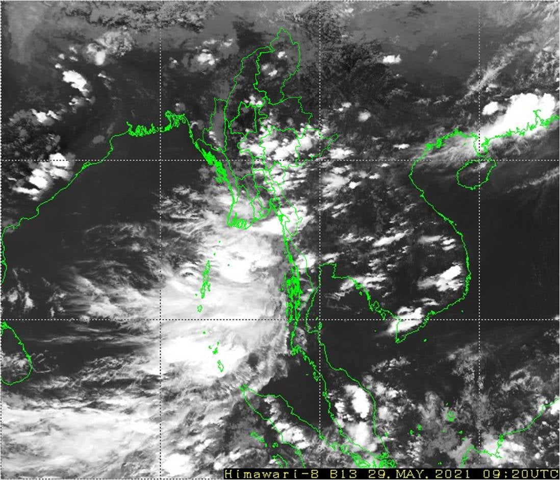 မိုးလေဝသနှင့် ဇလဗေဒညွှန်ကြားမှုဦးစီးဌာနမှ (၂၀၂၁ ခုနှစ်၊ မေလ (၂၉)ရက်နေ့ ညနေ(၄:၀၀) နာရီအချိန် ထုတ်ပြန်ချက်) ဘင်္ဂလားပင်လယ်အော် အခြေအနေ။ ကပ္ပလီပင်လယ်ပြင်၊ ဘင်္ဂလားပင်လယ်အော် တောင်ပိုင်းနှင့် အရှေ့အလယ်ပိုင်းတို့တွင် မုတ်သုံလေ အားအသင့်အတင့်မှ အားကောင်းနေပြီး၊ ကျန်ဘင်္ဂလားပင်လယ်အော်တွင် တိမ်အနည်းငယ် ဖြစ်ထွန်းနေပါသည်။ မနက်ဖြန်နံနက်အထိ ခန့်မှန်းချက်။ တနင်္သာရီတိုင်းဒေသကြီး၊ ကရင်ပြည်နယ်နှင့် မွန်ပြည်နယ် တို့တွင် နေရာအနှံ့အပြား၊ ပဲခူးတိုင်းဒေသကြီး၊ ရန်ကုန်တိုင်းဒေသကြီး၊ ဧရာဝတီတိုင်းဒေသကြီး၊ ရှမ်းပြည်နယ်(တောင်ပိုင်းနှင့် အရှေ့ပိုင်း)နှင့် ကယားပြည်နယ်တို့တွင် နေရာစိပ်စိပ်၊ နေပြည်တော်၊ မန္တလေးတိုင်းဒေသကြီး၊ ကချင်ပြည်နယ်နှင့် ချင်းပြည်နယ်တို့တွင် နေရာကျဲကျဲ နှင့် ကျန်တိုင်းဒေသကြီးနှင့် ပြည်နယ်တို့တွင် နေရာကွက်ကျား မိုးထစ်ချုန်းရွာပြီး၊ တနင်္သာရီ တိုင်းဒေသကြီးတွင် နေရာကွက်၍ မိုးကြီးနိုင်ပါသည်။ ရွာရန်ရာနှုန်း(၈၀) ဖြစ်ပါသည်။ မြန်မာ့ပင်လယ်ပြင်။ မြန်မာ့ကမ်းရိုးတန်း တစ်လျှောက်နှင့် ကမ်းလွန်ပင်လယ်ပြင်တို့တွင် တစ်ခါတစ်ရံ မိုးသက်လေပြင်းများကျရောက်ပြီး လှိုင်းအသင့်အတင့်မှ လှိုင်းကြီးနိုင်ပါသည်။ မိုးသက်လေပြင်းကျစဉ် ရေပြင်/မြေပြင်လေသည် တစ်နာရီလျှင် မိုင်(၃၀)မှ (၃၅)မိုင်အထိ တိုက်ခတ်နိုင်ပါသည်။ လှိုင်းအမြင့်မှာ မြန်မာ့ကမ်းရိုးတန်း တစ်လျှောက်နှင့် ကမ်းလွန် ပင်လယ်ပြင်တို့တွင် (၆)ပေမှ (၉)ပေခန့်ရှိနိုင်ပါသည်။ နောက်(၂)ရက်အတွက် ခန့်မှန်းချက်။ အနောက်တောင်မုတ်သုံလေသည် မြန်မာနိုင်ငံ အလယ်ပိုင်း ဒေသများသို့ ဝင်ရောက်နိုင်ပါသည်။ နေပြည်တော်နှင့် အနီးတစ်ဝိုက်အတွက် မနက်ဖြန်နံနက်အထိ ခန့်မှန်းချက်။ နေရာကွက်ကျား မိုးထစ်ချုန်းရွာမည်။ ရွာရန်ရာနှုန်း(၈၀) ဖြစ်ပါသည်။ ရန်ကုန်မြို့နှင့် အနီးတစ်ဝိုက်အတွက် မနက်ဖြန်နံနက်အထိ ခန့်မှန်းချက်။ မိုးတစ်ကြိမ်၊ နှစ်ကြိမ် ထစ်ချုန်းရွာမည်။ ရွာရန်ရာနှုန်းပြည့် ဖြစ်ပါသည်။ မန္တလေးမြို့နှင့် အနီးတစ်ဝိုက်အတွက် မနက်ဖြန်နံနက်အထိ ခန့်မှန်းချက်။ နေရာကွက်ကျား မိုးထစ်ချုန်းရွာနိုင်ပါသည်။ ရွာရန်ရာနှုန်း(၆၀) ဖြစ်ပါသည်။ #မိုးလေဝသနှင့် ဇလဗေဒညွှန်ကြားမှုဦးစီးဌာန