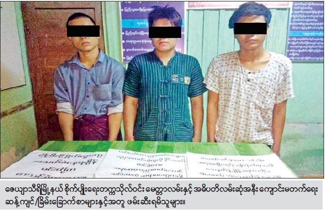 အလားတူ ကျောင်းများပြန်လည်ဖွင့်လှစ်ရာတွင် အနှောင့်အယှက်ဖြစ်စေမည့် စာသားများ ရေးသားဖြန့်ဝေလျက်ရှိသူများအား ထိန်းသိမ်းလျက်ရှိရာ နေပြည်တော် ကောင်စီနယ်မြေ၊ ပျဉ်းမနားမြို့နယ်၊ မင်္ဂလာရပ်ကွက်၊ ဗိုလ်ချုပ်လမ်းဘေး၊ အမှတ်(၂) အခြေခံပညာ အထက်တန်း ကျောင်း၌ စာရေးသားဖြန့်ဝေလျက်ရှိသော စည်သူဟန် (၃၁)နှစ်(ဘ)ဦးသိန်းဟန်၊ ဝေယံမျိုး (၁၄)နှစ်(ဘ)ဦးမိုးသီဟစိုးတို့အား မေလ ၂၆ ရက် ညပိုင်းတွင်လည်းကောင်း၊ ဥတ္တရသီရိမြို့နယ်၊ မင်းကုန်းကျေးရွာအုပ်စု၊ သဲကျွန်းကျေးရွာ၊ အခြေခံပညာ မူလတန်းလွန်ကျောင်း၌ စာရေးသား ဖြန့်ဝေလျက်ရှိသော ကျော်ကျော်အောင်(ခ)ကျော်ကျော် (၄၃)နှစ်(ဘ)ဦးအောင်မြင့်၊ အောင်ဆန်း ဦး(၃၃)နှစ် (ဘ)ဦးအောင်လွင်တို့ ၂ ဦးအား မေလ ၂၇ ရက် ညပိုင်းတွင် လည်းကောင်း၊ ဇေယျာသီရိမြို့နယ်၊ စိုက်ပျိုးရေးတက္ကသိုလ်ဝန်း၊ မေတ္တာလမ်းနှင့် အဓိပတိ လမ်းဆုံအနီးရှိ ဆိုင်းဘုတ်၌ ရေးသားဖြန့်ဝေသော ရှင်းသန့်မောင် (၁၇)နှစ် (ဘ) ဦးညီစိုး၊ ပိုင်စိုးထိုက်ကျော် (၁၇)နှစ်(ဘ)ဦးကျော်ဝင်းအောင်၊ ဇွဲမောင်မောင်(ခ) ညီခန့်(၁၇)နှစ် (ဘ)ဦးခင်မောင်အေးတို့အား မေ ၂၈ ရက်တွင် လည်းကောင်း ထိန်းသိမ်းရမိခဲ့သည်။