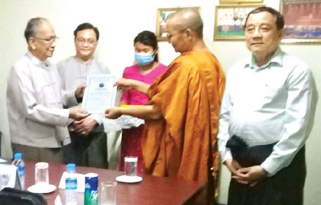 ရှေးဦးစွာ အလှူရှင်ဦးဝိလာသ (စာရေးဆရာ ကဗျာဆရာ ဝေမိုး- ကျွန်းလှ) က ဓမ္မဂုဏ်ရည် စာပေဆုရစာအုပ်များဖြစ်သည့်ပန်းမြိုင်လယ်စိန်ဝင်း ရေးသားသော လူသားနှင့် မူးယစ်ဆေးစာအုပ် ၆၁၄ အုပ်၊ အရှင်ရေဝတ (သရက်ကောင်း) ရေးသားသော ဘာ့ကြောင့်ဗုဒ္ဓဘာသာနိုင်ငံတွေ ကွယ်ပျောက်ခဲ့ရသလဲ စာအုပ် ၂၃၂ အုပ် စုစုပေါင်း တန်ဖိုးငွေကျပ် ၁၀၅၀၀၀၀ ခန့် တန်ဖိုးရှိ စာအုပ်များ ကို ပေးအပ်လှူဒါန်းရာ အသင်းဥက္ကဋ္ဌက လက်ခံ ရယူပြီး ဂုဏ်ပြုမှတ်တမ်းလွှာ ပြန်လည်ဆက်ကပ် ပေးအပ်သည်။