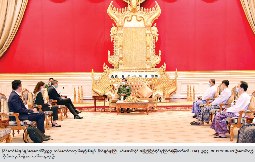 နိုင်ငံတော်စီမံအုပ်ချုပ်ရေးကောင်စီဥက္ကဋ္ဌ၊ တပ်မတော်ကာကွယ်ရေးဦးစီးချုပ် ဗိုလ်ချုပ်မှူးကြီး မင်းအောင်လှိုင်သည် အပြည်ပြည်ဆိုင်ရာကြက်ခြေနီကော်မတီ (ICRC) ဥက္ကဋ္ဌ Mr. Peter Maurer ဦးဆောင်သည့် ကိုယ်စားလှယ်အဖွဲ့အား ယနေ့နံနက် ၁၁ နာရီတွင် နိုင်ငံတော်စီမံအုပ်ချုပ်ရေးကောင်စီရုံး၌ လက်ခံတွေ့ဆုံသည်။