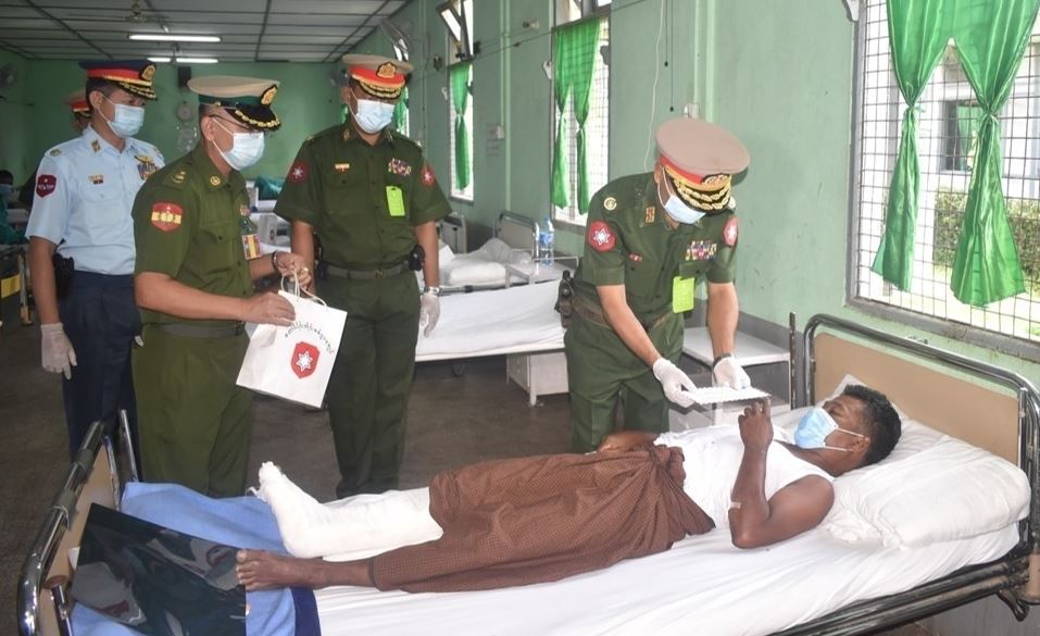 ယနေ့တွင် ကချင်ပြည်နယ်၊ မြစ်ကြီးနားမြို့ရှိ နယ်မြေခံတပ်မတော်ဆေးရုံ၊ ရှမ်းပြည်နယ် (အရှေ့ပိုင်း)၊ ကျိုင်းတုံမြို့ရှိ နယ်မြေခံတပ်မတော်ဆေးရုံ၊ ဧရာဝတီတိုင်း ဒေသကြီး၊ ပုသိမ်မြို့ရှိ နယ်မြေခံဆေးတပ်ရင်းနှင့် ပဲခူးတိုင်းဒေသကြီး၊ တောင်ငူမြို့ရှိ နယ်မြေခံတပ်မတော်ဆေးရုံတို့၌ တက်ရောက်ဆေးကုသမှုခံယူလျက်ရှိသော ဒေသခံပြည်သူများ၊ အရာရှိ၊ စစ်သည်၊ မိသားစု ဝင်များအား သက်ဆိုင်ရာ တိုင်းစစ်ဌာနချုပ် အသီးသီးမှ တိုင်းမှူးများနှင့် တာဝန်ရှိ သူများက သွားရောက်ကြည့်ရှုအားပေးပြီး တစ်ဦးချင်းစီ၏ ရောဂါဖြစ်ပွားမှု၊ ဆေးဝါး ကုသပေးထားမှုနှင့် ကျန်းမာရေး တိုးတက်ကောင်း မွန်မှုအခြေအနေများအား ရင်းရင်းနှီးနှီး မေးမြန်းအားပေး စကားပြောကြားပြီး စားသောက်ဖွယ်ရာများ ပေးအပ်ခဲ့ကြောင်း သတင်း ရရှိသည်။