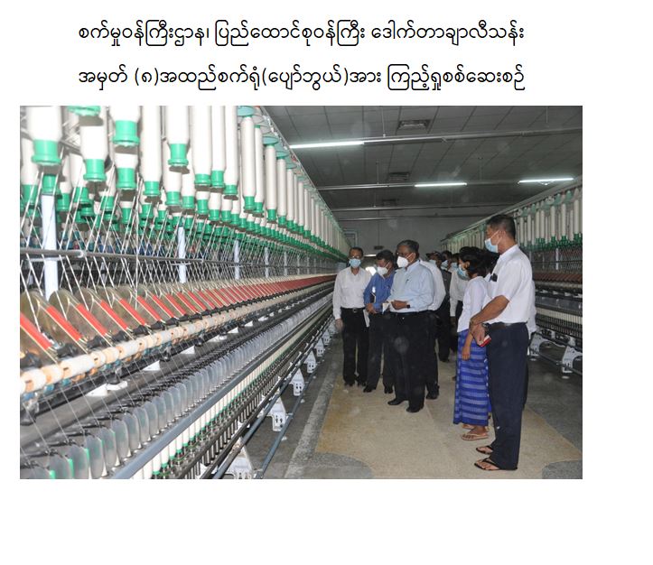 ဆက်လက်၍ ပြည်ထောင်စုဝန်ကြီးသည် ပျော်ဘွယ်မြို့ရှိ အမှတ်(၈)အထည် စက်ရုံသို့ ရောက်ရှိပြီး စက်ရုံမှူးက စက်ရုံဆိုင်ရာ အချက်အလက်များကို ရှင်းလင်းတင်ပြရာ ပြည်ထောင်စု ဝန်ကြီးက စက်ရုံရှိ ဝန်ထမ်းများကိုလည်း အရည်အသွေးမြင့် ထုတ်ကုန်များတိုးမြှင့် ထုတ်လုပ် နိုင်ရေးအတွက် လေ့ကျင့်သင်ကြားပေးရန်၊ ပြည်တွင်းရှိစက်ရုံများ ကုန်ထုတ်လုပ်မှု လုပ်ငန်းများ ဆောင်ရွက်ခြင်းဖြင့် ပြည်ပသွင်းကုန်များကို အစားထိုးနိုင်မည်ဖြစ်ကြောင်း၊ ရပ်နားထားသော စက်ရုံများ ပြန်လည်လည်ပတ် နိုင်ရေးအတွက် ဝန်ထမ်းများအားလုံး ပူးပေါင်းဆောင် ရွက်ကြရန် မှာကြားပြီး ချည်ထုတ်လုပ်နေမှုအဆင့်ဆင့်နှင့် ဝါကြိတ်စက်ရုံ တို့ကိုလှည့်လည် ကြည့်ရှု စစ်ဆေးသည်။