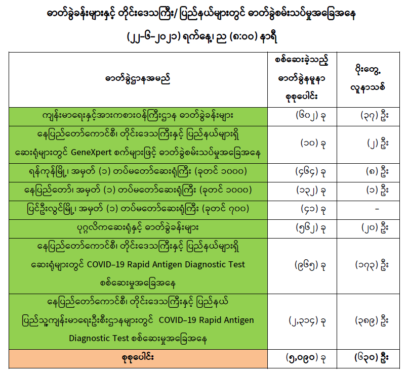 (၂၁-၆-၂၀၂၁) ရက်နေ့၊ ည (၈:၀၀) နာရီမှ (၂၂-၆-၂၀၂၁) ရက်နေ့၊ ည (၈:၀၀) နာရီအတွင်း ဓာတ်ခွဲနမူနာ စုစုပေါင်း (၅,၀၉၀)ခုအား စစ်ဆေးပြီးစီးခဲ့ရာ COVID-19 ရောဂါ ဓာတ်ခွဲအတည်ပြု လူနာသစ် (၆၃၀) ဦး တွေ့ရှိရပါသည်။ သို့ဖြစ်ပါ၍ ယနေ့အထိ ဓာတ်ခွဲနမူနာ စုစုပေါင်း (၂,၆၈၄,၇၅၆) ခု အား စစ်ဆေးခဲ့ပြီး COVID-19 ဓာတ်ခွဲအတည်ပြုလူနာ စုစုပေါင်း (၁၄၉,၂၄၇) ဦး ရှိပြီ ဖြစ်ပါသည်။