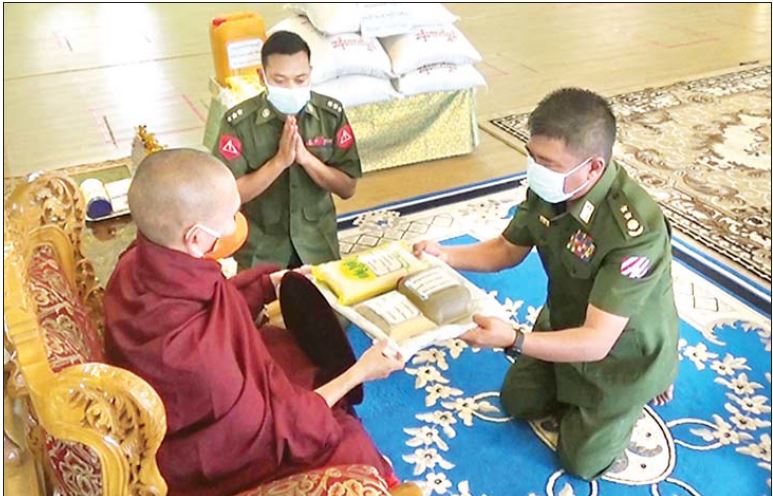 ထိုသို့ ဆောင်ရွက်လျက်ရှိရာ ယနေ့တွင် ရန်ကုန်တိုင်းဒေသကြီး အင်းစိန်မြို့နယ် အောင်ဆန်း ရပ်ကွက်ရှိ မဟာမြိုင်သာသန ဝိပုလကာရီကျောင်းတိုက်နှင့် တိုက်ကြီးမြို့နယ် ဥက္ကံမြို့ ရှမ်းတောလေးကျေးရွာရှိ ရှမ်းစိန်ကျောင်းကြီးကျောင်းတိုက်နှင့် မွန်ပြည်နယ် မော်လမြိုင်မြို့ မေဓါရာမကျောင်းတိုက်တို့မှ သံဃာတော်များနှင့် သာသနာ့နွယ်ဝင်သီလရှင်များ အား ဆွမ်းဆန်တော်၊ ဆီ၊ ဆား၊ ပဲ အမယ်လေးမျိုး၊ ကိုဗစ်- ၁၉ ရောဂါကာကွယ်ရေး အထောက်အကူပြု ပစ္စည်းများနှင့် လှူဖွယ်ပစ္စည်းများကို လည်းကောင်း၊ မွန်ပြည်နယ် မော်လမြိုင်မြို့ မေဓါရာမကျောင်းတိုက် နှင့် မန္တလေးတိုင်းဒေသကြီး မဟာအောင်မြေမြို့နယ် မဟာနွယ်စဉ်ရပ်ကွက်ရှိ မဟာဗောဓိပရိယတ္တိရိပ်သာ ကျောင်းတိုက်တို့မှ သံဃာတော်များအား နေ့ဆွမ်း များကိုလည်းကောင်း သက်ဆိုင်ရာတိုင်းစစ်ဌာနချုပ် များအလိုက် တာဝန်ရှိသူများက သွားရောက်၍ ဆက်ကပ်လှူဒါန်းကြသည်။ ။