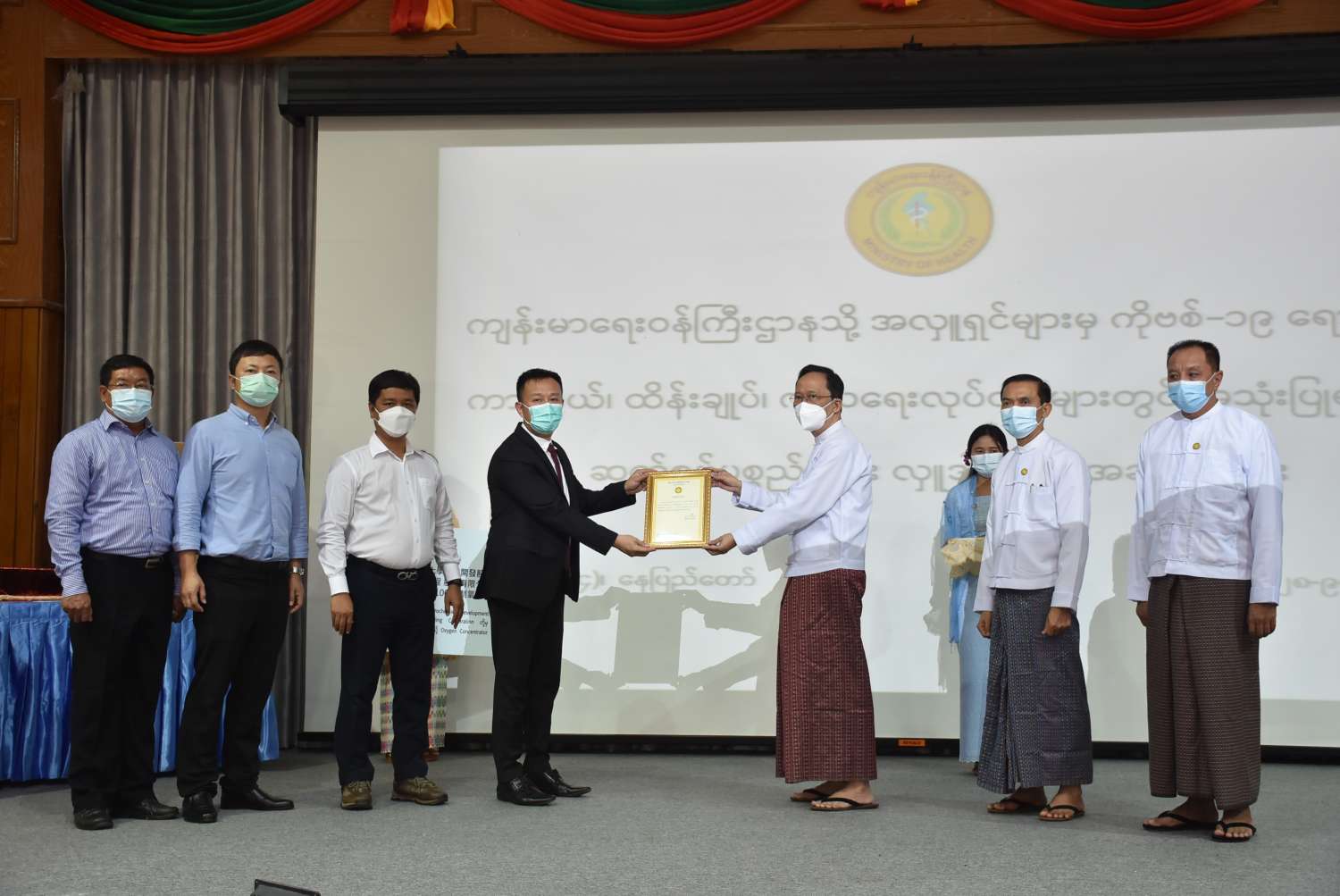 ထို့နောက် ကိုဗစ်-၁၉ ရောဂါ ကာကွယ်၊ ထိန်းချုပ်၊ ကုသရေးလုပ်ငန်းများတွင် အသုံးပြုရန် Myanmar Quarry-Infrastructure Development Public Company Limited မှ Oxygen Concentrator (10 L) အလုံး(၁၀၀) Novel Shinning Star Company Limited မှ PPE (Level-3) ဝတ်စုံ(၂၀၀) Pulse Oximeter အလုံး(၁၀၀) နှင့် Oxygen Concentrator () လုံးကို လွှဲပြောင်းပေးအပ်လှူဒါန်းရာ ကျန်းမာရေးဝန်ကြီးဌာန ပြည်ထောင်စုဝန်ကြီး ဒေါက်တာ သက်ခိုင်ဝင်း က လက်ခံရယူ၍ ဂုဏ်ပြုမှတ်တမ်းလွှာများ ပြန်လည်ပေးအပ်သည်။