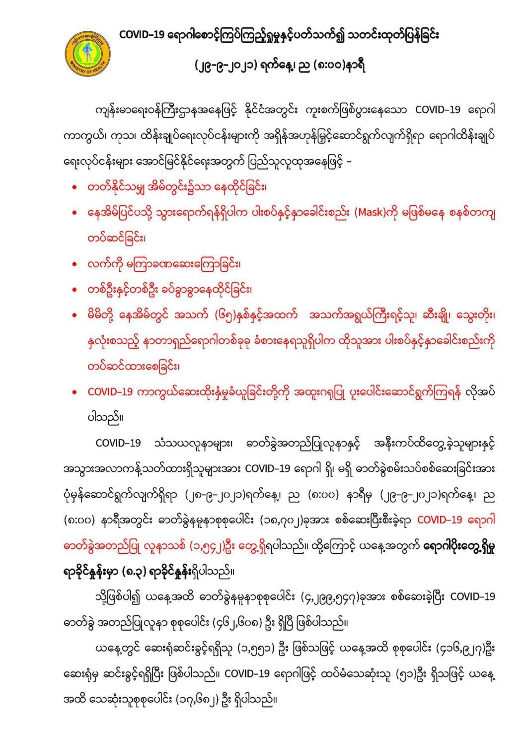 COVID-19 ရောဂါစောင့်ကြပ်ကြည့်ရှုမှုနှင့်ပတ်သက်၍သတင်းထုတ်ပြန်ခြင်း(၂၉-၉-၂၀၂၁) ရက်နေ့၊ ည (၈:၀၀)နာရီ 09/29/2021