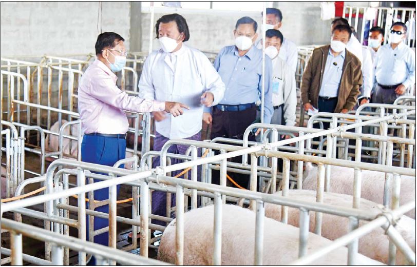ထို့နောက် နိုင်ငံတော်စီမံအုပ်ချုပ်ရေးကောင်စီဥက္ကဋ္ဌ၊ နိုင်ငံတော်ဝန်ကြီးချုပ်နှင့် အဖွဲ့ဝင်များသည် ရှမ်းရိုးမမွေးမြူရေးဇုန်အတွင်းရှိ ဒေါက်တာစိုင်းလုံ၏ ဥစားကြက် မွေးမြူရေးခြံနှင့် Farm Myanmar Co,Ltd မှ လုပ်ဆောင်လျက်ရှိသည့် မျိူးဖောက် ဝက်မွေးမြူထားရှိမှုတို့ကို သွားရောက်ကြည့်ရှု အားပေးခဲ့ပြီး မွေးမြူရေးကဏ္ဍ ဖွံ့ဖြိုးတိုးတက်ရေးအတွက် လုပ်ဆောင်နိုင်မည့် အခြေအနေများနှင့် ပတ်သက်၍ ဆွေးနွေးခဲ့ကြသည်။