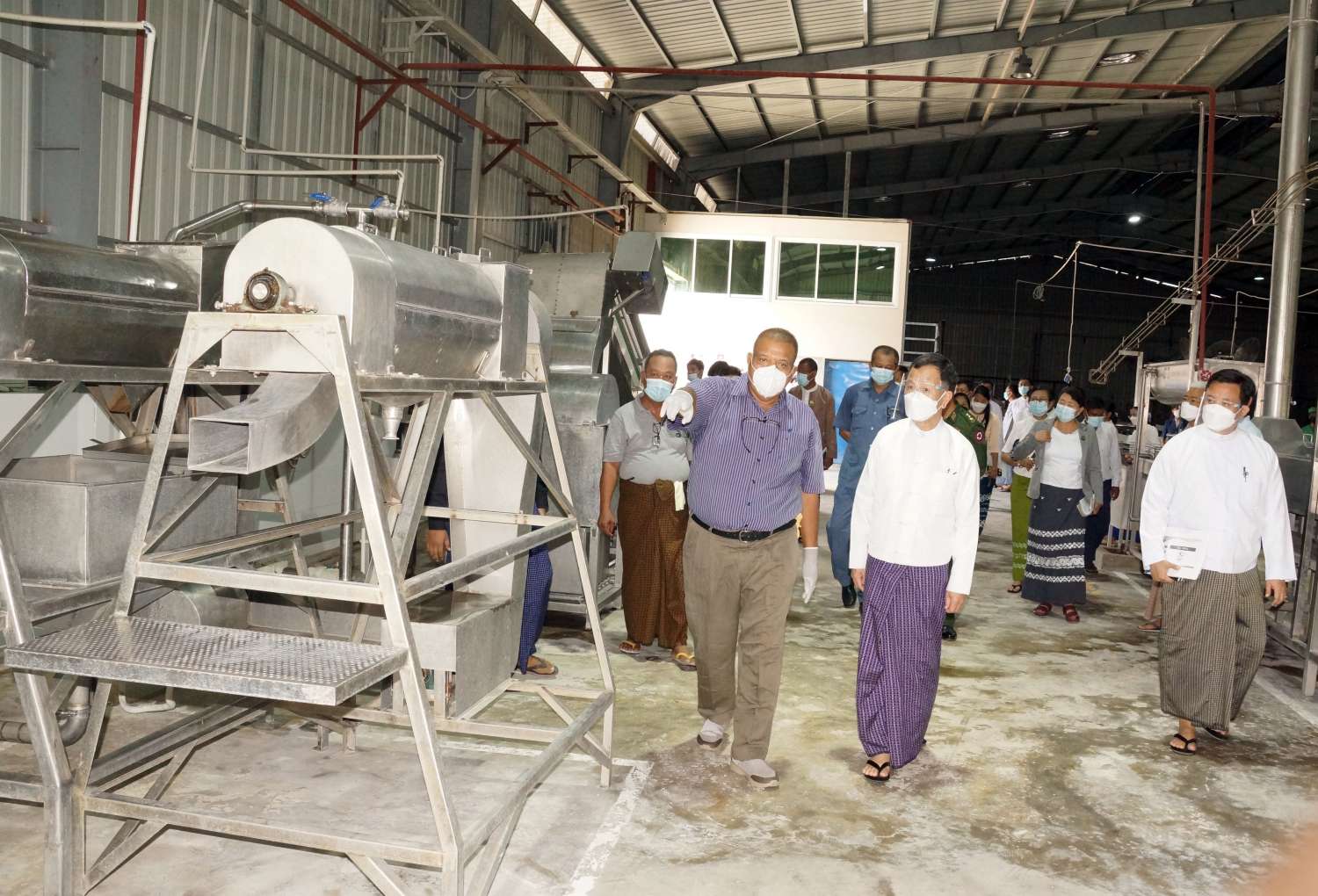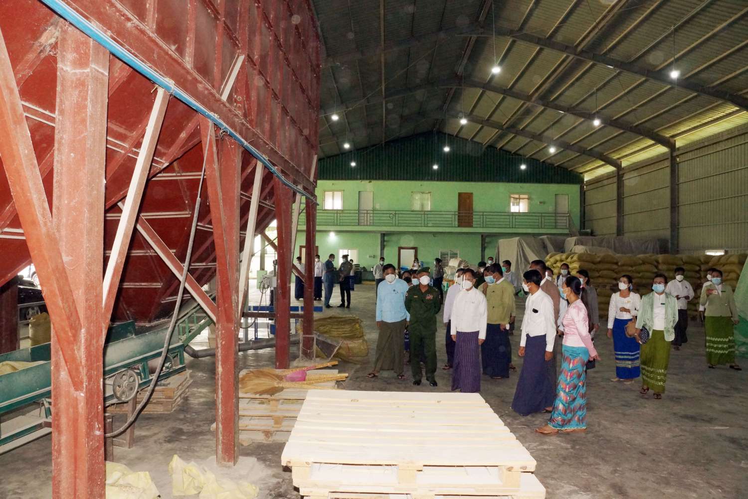 ထို့နောက် MAYLP Agiriculture Co.,Ltd စပါးအခြောက်ခံစက်လုပ်ငန်းသို့ရောက်ရှိရာ General Manager ဒေါ်နန်းထက်ထက်လှိုင်က ကန်ထရိုက်လယ်ယာစနစ်ဖြင့် အရည်အသွေးမြင့် စပ်မျိုးစပါးများ၊ Quality Fragrance Rice စိုက်ပျိုးထုတ်လုပ်ခြင်းနှင့် စပါးအခြောက်ခံ ခြင်းလုပ်ငန်းများ ဆောင်ရွက်မှုကို ရှင်းလင်းတင်ပြရာ နေပြည်တော်ကောင်စီဥက္ကဋ္ဌက တောင်သူများကို ဆန်အရည်အသွေးမြင့်မားပြီး အထွက်နှုန်းကောင်းမွန်သည့် စပါးမျိုးများ စိုက်ပျိုးထုတ်လုပ်နိုင်ရေး စိုက်ပျိုးနည်း စနစ်များနှင့် မျိုးစပါးများကို ဖြန့်ဖြူးပေးစေလိုကြောင်း၊ တောင်သူများ အကျိုးစီးပွားဖြစ်ထွန်းပြီး လူနေမှုအဆင့်အတန်းမြင့်မား လာစေရန်အတွက် စိုက်ပျိုးရေးပညာပေးလုပ်ငန်းများကို သက်ဆိုင်ရာဌာနဆိုင်ရာများနှင့် ပူးပေါင်းဆောင်ရွက်ကြ စေလိုကြောင်း မှာကြားပြီး နှာခေါင်းစည်း (Mask) များပေးအပ်ကာ စက်ရုံလည်ပတ်နေမှုကို လှည့်လည်ကြည့်ရှုသည်။