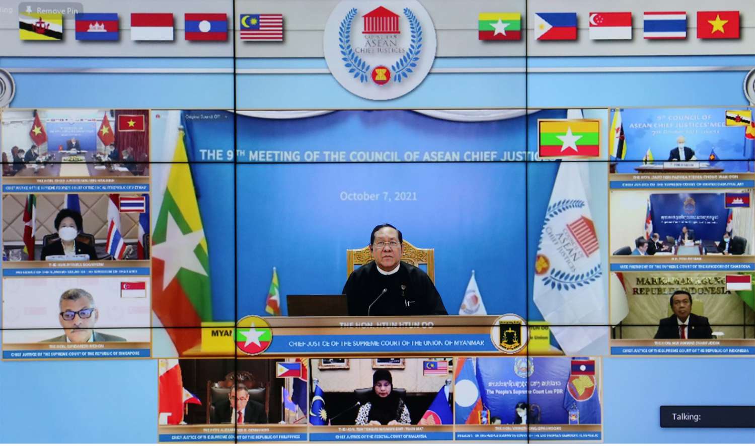 အင်ဒိုနီးရှားသမ္မတနိုင်ငံ၊ တရားရုံးချုပ်မှကြီးမှူး၍ “() ကြိမ်မြောက် အာဆီယံတရားသူကြီးချုပ် များကောင်စီ အစည်းအဝေး (The 9th Meeting of the Council of ASEAN Chief Justices)” ကို ယနေ့ နံနက် နာရီတွင် ဗီဒီယိုကွန်ဖရင့်စနစ်ဖြင့် ကျင်းပရာ ပြည်ထောင်စုတရားသူကြီးချုပ် ဦးထွန်းထွန်းဦးသည် နေပြည်တော်ရှိ ပြည်ထောင်စုတရား လွှတ်တော်ချုပ်ရုံးမှ ပါဝင်တက် ရောက်သည်။