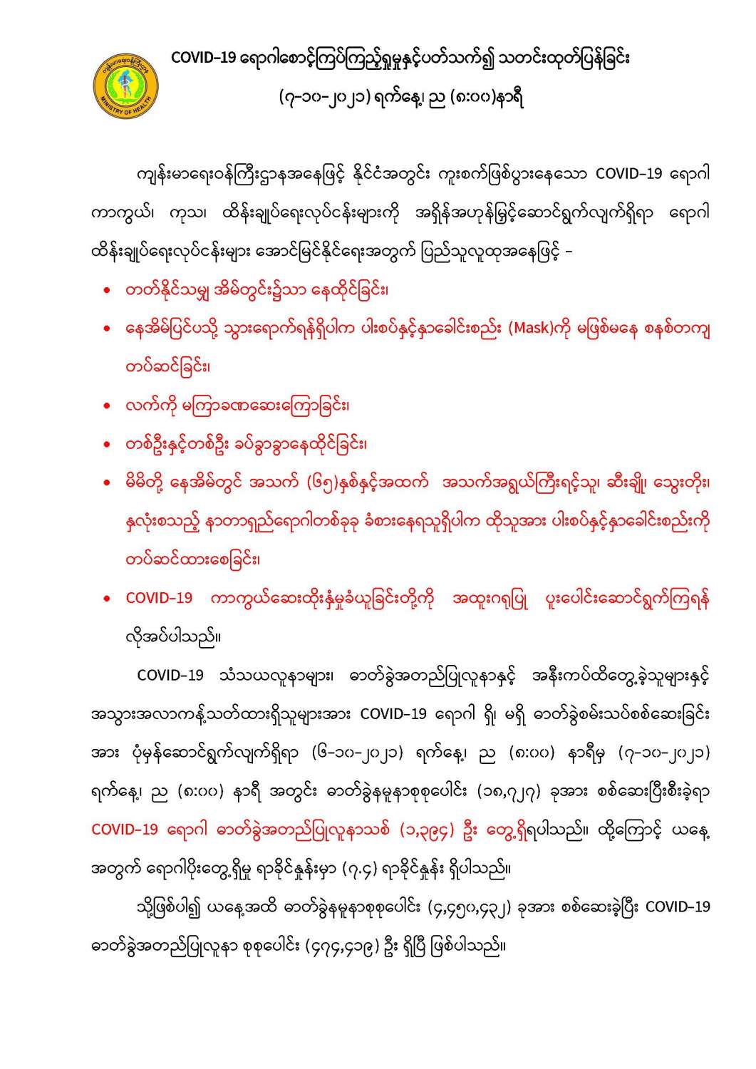 COVID-19 ရောဂါ စောင့်ကြပ်ကြည့်ရှုမှုနှင့်ပတ်သက်၍ သတင်းထုတ်ပြန်ခြင်း (၇-၁၀-၂၀၂၁) ရက်နေ့၊ ည (၈:၀၀)နာရီ