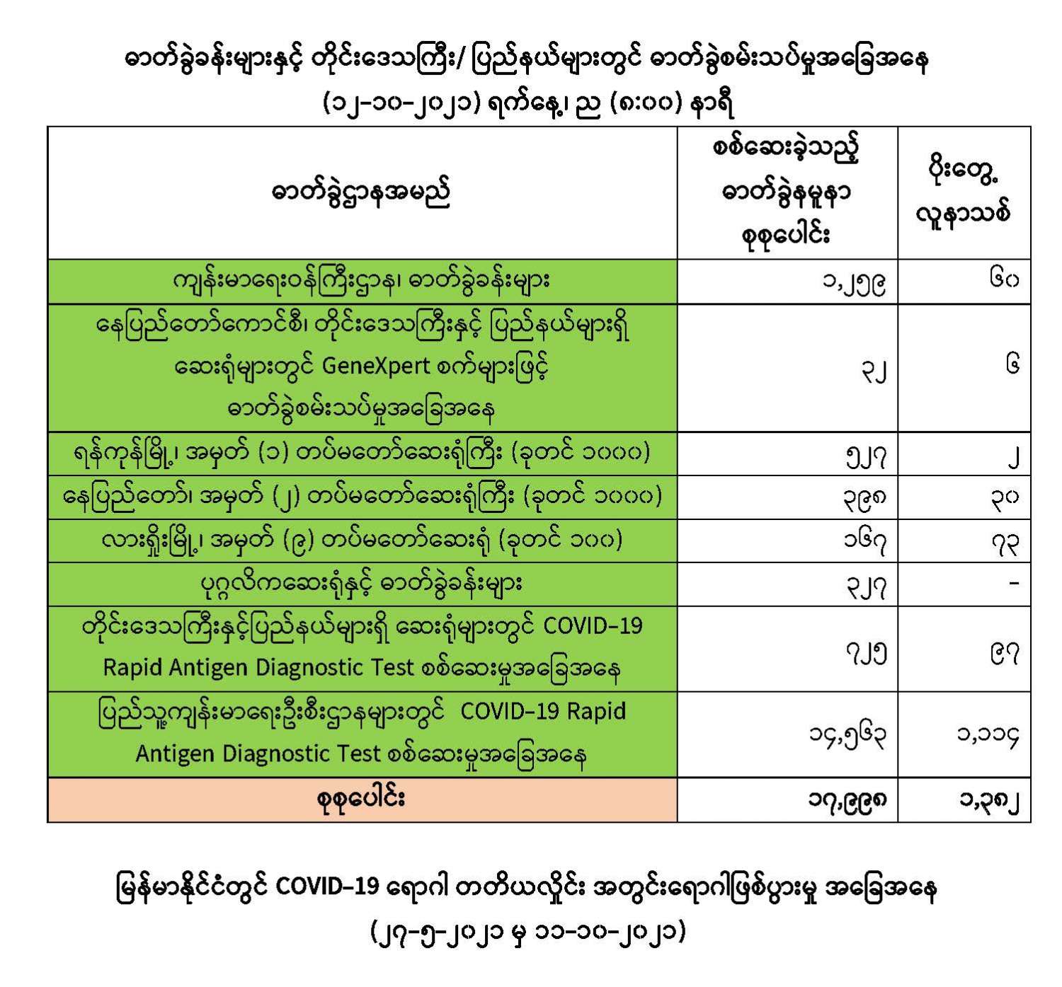 COVID-19 ရောဂါစောင့်ကြပ်ကြည့်ရှုမှုနှင့်ပတ်သက်၍ သတင်းထုတ်ပြန်ခြင်း (၁၂-၁၀-၂၀၂၁) ရက်နေ့၊ ည (၈:၀၀)နာရီ 10/12/2021 COVID-19 ရောဂါစောင့်ကြပ်ကြည့်ရှုမှုနှင့်ပတ်သက်၍ သတင်းထုတ်ပြန်ခြင်း (၁၂-၁၀-၂၀၂၁) ရက်နေ့၊ ည (၈:၀၀)နာရီ