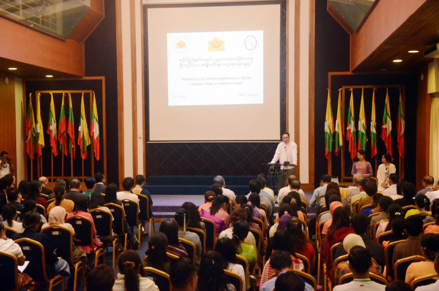 နိုင်ငံတော်အတိုင်ပင်ခံရုံးဝန်ကြီးဌာန၊ အမျိုးသားပြန်လည်သင့်မြတ်ရေးနှင့် ငြိမ်းချမ်းရေးဗဟိုဌာန (NRPC)၊ ကွဲပြားခြားနားမှုနှင့် အမျိုးသားရေး သဟဇာတဖြစ်မှုဆိုင်ရာ လေ့လာရေးအဖွဲ့ (CDNH) တို့ ပူးပေါင်းပြုလုပ်သည့် ရခိုင်ပြည်နယ်အတွင်း လူမှုသဟဇာတ ဖြစ်စေရေး ဦးတည်သော အမျိုးသမီးများ တွေ့ဆုံဆွေးနွေးပွဲ ဖွင့်ပွဲအခမ်းအနားကို ယနေ့နံနက် ၉ နာရီခွဲက ရန်ကုန်မြို့၊ ရွှေလီလမ်းရှိ အမျိုးသားပြန်လည်သင့်မြတ်ရေးနှင့် ငြိမ်းချမ်းရေး ဗဟိုဌာန(NRPC) ရန်ကုန်ရုံး၌ ကျင်းပသည်။
