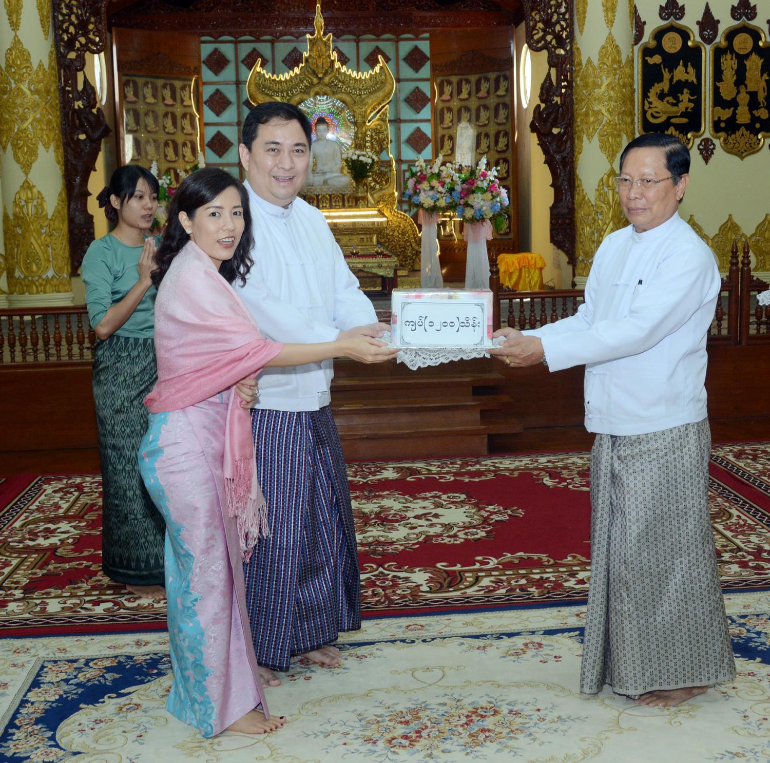 အလှူတော်ငွေပေးအပ်လှူဒါန်းပွဲ အခမ်းအနားတွင် Fuxing Brothers Group of Companies ဥက္ကဋ္ဌ ဦးအိုင်ထွန်း+သုဓမ္မသိင်္ဂီ ဒေါ်နန်းခင်ညွန့် မိသားစုက ထာဝရ ငြိမ်းချမ်းရေး စေတီတော် ဘက်စုံ မွမ်းမံ တည်ဆောက်ရေးနှင့် အချော သတ်လုပ်ငန်းများ ဆောင်ရွက်ရန်အတွက် အလှူငွေ ကျပ်သိန်း ၃၃၂၀ နှင့် နယ်စပ်တောင်တန်းဒေသ သာသနာပြု လုပ်ငန်းများ အတွက် အလှူငွေကျပ် သိန်း ၃၀၀ ၊ အဂ္ဂမဟာသီရိသုဓမ္မ မဏိဇောတဓရ ဦးဇော်မိုးခိုင် + ဒေါက်တာစောနေနွယ် (AA Medical Products Co., Ltd.) မိသားစုက  ထာဝရ ငြိမ်းချမ်း ရေးစေတီတော် ဘက်စုံမွမ်းမံတည်ဆောက်ရေးနှင့် အချောသတ်လုပ်ငန်းများ ဆောင်ရွက်ရန် အတွက် အလှူငွေကျပ် သိန်း ၁၂၀၀ နှင့် နယ်စပ်တောင်တန်းဒေသ သာသနာပြု လုပ်ငန်းများအတွက် အလှူ ငွေကျပ် သိန်း ၃၅၀ တို့ကိုလည်းကောင်း၊ ထာဝရငြိမ်းချမ်းရေးစေတီတော် ဘက်စုံမွမ်းမံ တည်ဆောက်ရေး နှင့် အချောသတ် လုပ်ငန်းများ  ဆောင်ရွက်ရန် အတွက် ဦးဝင်းဖေ + ဒေါ်ရွှေချော၊ သမီး သီရိသုဓမ္မသိင်္ဂီ ဒေါ်နီလာ၊ သီဟသုဓမ္မသိင်္ဂီ ဒေါ်နန်းဝါ မိသားစုက အလှူငွေကျပ် သိန်း ၁၀၀၀ ၊ သီရိသုဓမ္မမဏိဇောတဓရ ဦးမိုးအား အမှူးထား၍ ဗိုလ်မှူး ကျော်ကိုကိုရှိန်း+ မမိုးပြည့်ပြည့်ဖြိုး မိသားစု(မုံရွာဆရာမိုး တိုင်းရင်းဆေးဝါး ထုတ်လုပ် ရေးနှင့် KS Diamond ရတနာဆိုင်) က အလှူငွေကျပ် သိန်း ၅၀၀ ၊ SME Development Bank ဒုတိယဥက္ကဋ္ဌ ဒေါက်တာ ဇေယျာညွန့် + သီရိသုဓမ္မသိင်္ဂီ ဒေါ်အိသန္တာဘို မိသားစုက  အလှူငွေကျပ် သိန်း ၂၀၀ ၊ သီဟ သုဓမ္မသိင်္ဂီ ဒေါ်ပိုးအိဖြူမောင် (ပြည့်ဝခိုင်မာ  ဆောက် လုပ်ရေးကုမ္ပဏီ)က အလှူငွေကျပ် သိန်း ၁၀၀ နှင့် ဦးဇော်မင်းခိုင် + ဒေါ်ဥမ္မာခိုင် မိသားစု(မြန်မာ့ရိုးရာစက်မှု လက်မှုကုမ္ပဏီလီမိတက်)က အလှူငွေ ကျပ် သိန်း ၅၀ တို့ကိုလည်း ကောင်းပေးအပ်လှူဒါန်းကြရာ သာသနာရေးနှင့် ယဉ်ကျေးမှုဝန်ကြီးဌာန  ပြည်ထောင်စု ဝန်ကြီး သူရဦးအောင်ကိုက လက်ခံရယူပြီး ဂုဏ်ပြုမှတ်တမ်းလွှာများ  ပြန်လည်ပေးအပ်ကာ ကျေးဇူး တင် ဝမ်းမြောက် စကား  ပြောကြားသည်။