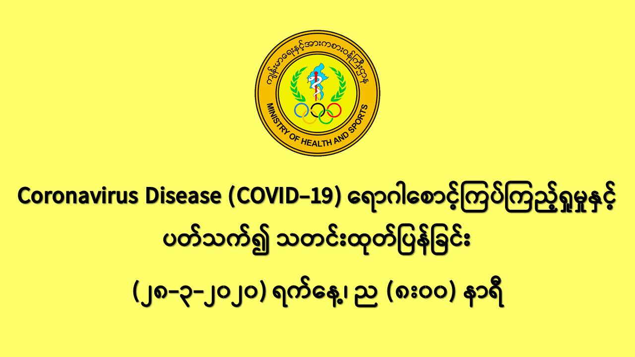 ၁။ ကျန်းမာရေးနှင့်အားကစားဝန်ကြီးဌာနသည် ကမ္ဘာ့နိုင်ငံများတွင် ကူးစက်ပျံ့နှံ့လျက်ရှိသည့် COVID-19 လတ်တလောအသက်ရှူလမ်းကြောင်းဆိုင်ရာ ရောဂါဖြစ်ပွားမှုဖြစ်စဉ်နှင့်ပတ်သက်၍ ရောဂါစောင့်ကြပ်ကြည့်ရှုခြင်း လုပ်ငန်းများအား အပြည်ပြည်ဆိုင်ရာ ဝင်ပေါက်၊ ထွက်ပေါက်ဂိတ် များတွင်လည်းကောင်း၊ ဆေးရုံအခြေပြုအဖြစ်လည်းကောင်း၊ ပြည်သူလူထုအခြေပြု စောင့်ကြပ် ကြည့်ရှုခြင်းလုပ်ငန်းများဖြင့်လည်းကောင်း၊ ပုဂ္ဂလိကဆေးရုံများနှင့် ပူးပေါင်း၍လည်းကောင်း ဆောင်ရွက်လျက်ရှိပါသည်။