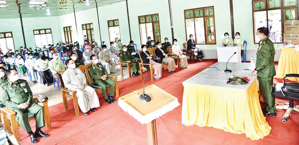 တပ်မတော်ကာကွယ်ရေးဦးစီးချုပ် ဗိုလ်ချုပ်မှူးကြီး မင်းအောင်လှိုင် ရွာငံမြို့နယ်မှ ဒေသခံတိုင်းရင်းသားများနှင့် တွေ့ဆုံ စာကြည့်တိုက်အတွက် စာအုပ်စာစောင်များနှင့် COVID-19 ရောဂါ ကာကွယ်၊ ထိန်းချုပ်၊ ကုသရေးပစ္စည်းများ ပေးအပ်လှူဒါန်း